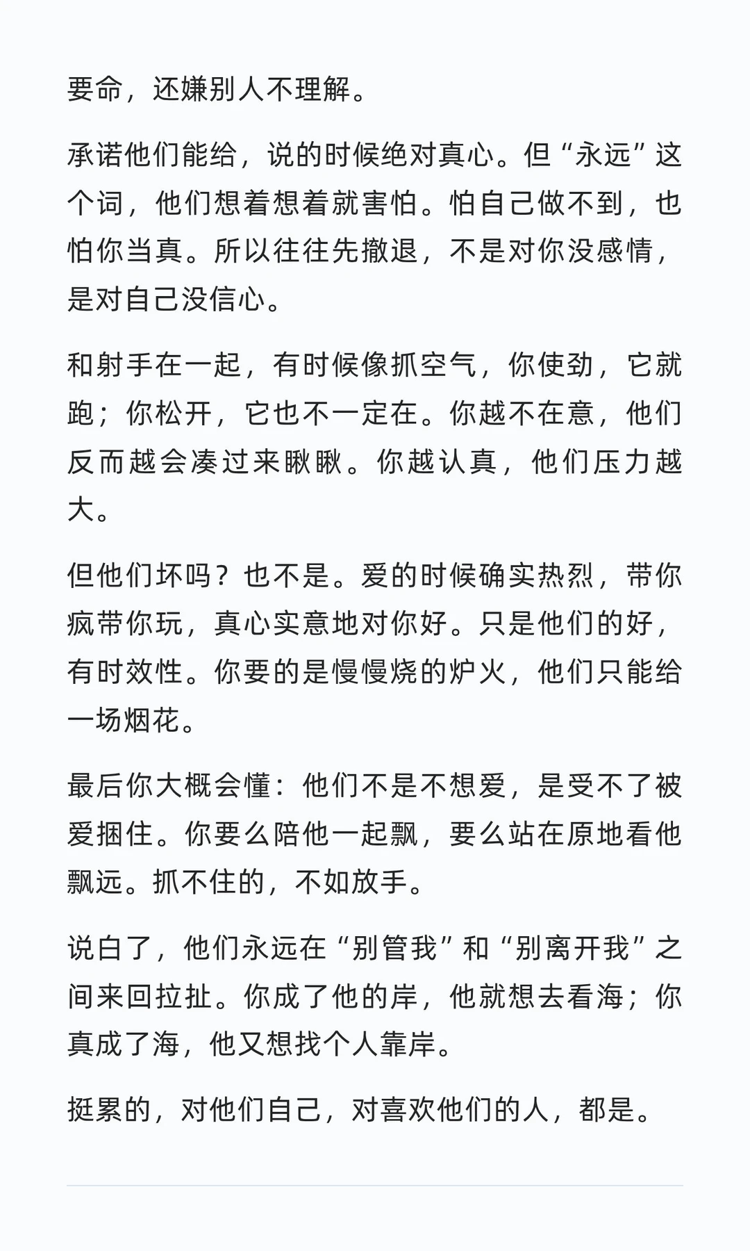射手座在感情中既热烈又逃避,喜欢自由和心动的恋爱状态,但一旦关系稳定,就难以适应日常琐碎。他们真心的给出承诺,却害怕“永远”,因为怕自己做不到。感情中,他们像抓空气,你在意时他们靠近,你松开时他们飘远。