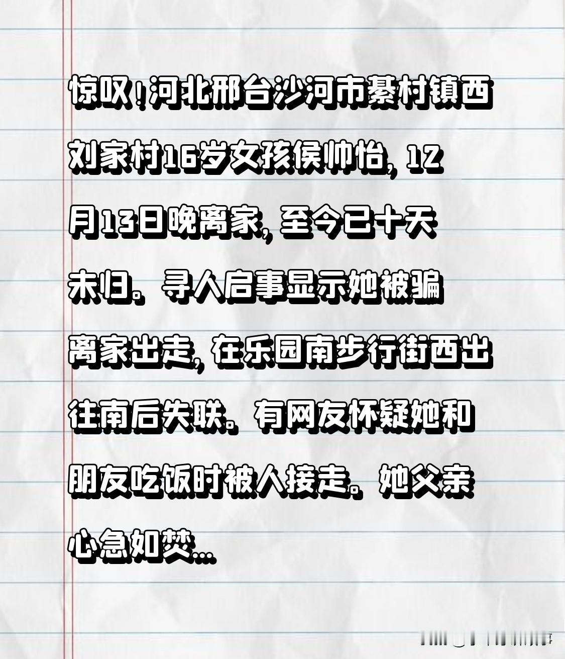 惊叹!河北邢台沙河市綦村镇西刘家村16岁女孩侯帅怡,12月13日晚离家,至今已十日未归。寻人启事表明她被骗离家出走,于乐园南步行街西出往南后失联。有网友猜测她和朋友吃饭时被人接走。 她父亲心急如焚,挂着牌子四处寻觅。目前已报警,还有志愿者助力。有网友称曾在当地台球厅见女孩,志愿者正调监控核实。 16岁易叛逆、难拒诱惑。望大家留意,也提醒家长多与孩子交流,树立正能量。愿女孩平安回家。