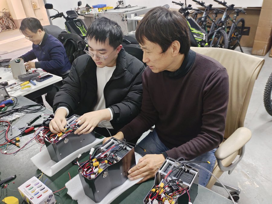 高鞠(右一)带领团队研发氢能两轮车动力系统。晶擎供图