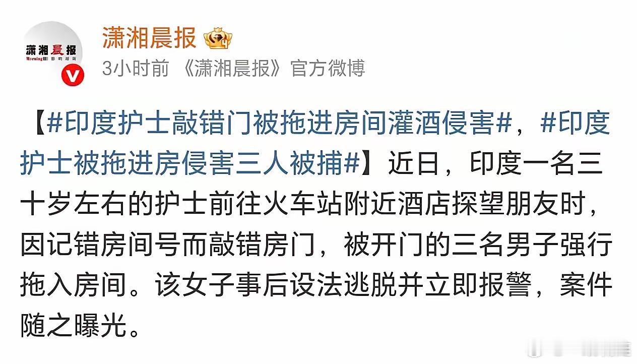 印度一名女护士,去朋友那里借钱,因为敲错房门,被3名男子拖进房间侵犯4小时!有意思的是,三名男子的身份并不普通。印度一名30岁左右的女护士,到朋友那里借钱,朋友暂时住在火车站附近酒店的105号房间。但是女护士错误走到了205号房间,被房间内的3名男子骗进屋里,然后实施了4小时的侵犯。之后,这三名男子被逮捕,身份也随之曝光,还并不普通。两人是银行职员,一人是某顶级高校的在读硕士研究生。不得不说,银行职员和在读硕士,在印度算是高知群体了,可即便是这样的高知人群,依旧可以随时起意侵犯陌生女性,只能说真的是相当随便了,因为不会受到太严重的惩罚,代价太低了。