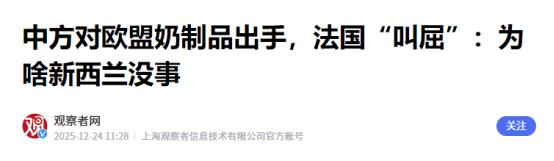 欧盟很恼火:我只是给中国电车加了点税,中国干嘛对我发起反制?   先说说欧盟怎么“先动手”的。这事儿得追溯到2023年9月,欧盟委员会主席冯德莱恩在国情咨文里一嗓子,宣布要对中国电动汽车发起反补贴调查,理由是“中国电车靠补贴抢占欧洲市场”。   折腾了一年多,到2024年10月,欧盟正式拍板:对中国电池电动车征收五年反补贴税,比亚迪要交17%,上汽更是被课以35.3%的重税,没配合调查的企业直接按最高35.3%算。   这哪是“加了点税”,分明是给中国电车出口欧洲设了道高门槛——要知道中国去年出口的128万辆电动车里,欧洲可是重要市场,这么一来不少企业订单直接黄了。 更有意思的是法国在里头的角色。   马克龙政府一直是对华电车关税的“急先锋”,毕竟法国本土汽车业在电动车赛道落后不少,想靠关税把中国车挡在门外。今年12月初马克龙刚访华时还聊合作,回国没几天就放话“中欧贸易不平衡,要用电税和反胁迫工具对付中国”,活脱脱一副“谈不拢就翻脸”的架势。   法国这波操作,等于是把欧盟的贸易大棒递到了最前面,也给自己埋下了隐患。 中国的反制来得不快但够准。2025年12月23日,商务部一纸公告砸下来:对原产于欧盟的相关乳制品加征21.9%到42.7%的临时反补贴税,当天就生效。   别以为“相关乳制品”是泛泛而谈,清单里全是欧盟的强项:鲜乳酪、加工奶酪、蓝纹乳酪,连脂肪含量超10%的稀奶油都算在内,法国大名鼎鼎的罗克福蓝纹奶酪、卡芒贝尔软质奶酪全在里面。   更耐人寻味的是抽样的15家企业里,12家是法国公司,等于精准瞄准了法国 dairy 行业的“七寸”。 为啥偏偏盯着法国打?看数据就懂了。欧盟的乳制品补贴早就是公开的秘密,靠着“共同农业政策”,欧洲奶农每年能拿到巨额补贴,这些钱最终都变成了低价出口的奶酪和奶油。   而法国在其中占了大头——虽然2025年前8个月法国对中国乳制品出口同比降了24.2%,但架不住它是欧盟里推动贸易保护最积极的,不打它打谁?   商务部调查时发现,这些补贴乳制品涌入中国后,国内乳企库存越堆越多,原本盈利的企业直接转亏,实实在在造成了损害,反制完全是按规矩办事。 欧盟的反应堪称“双重标准现场教学”。   欧盟贸易发言人奥洛夫·吉尔立马跳出来喊冤,说中国调查“证据不足”,是“关系负面升级”,还放话要向WTO申诉。可当初他们给中国电车加税时,咋不说自己证据有问题?   那时欧盟委员会贸易专员还理直气壮宣称“是为了创造公平环境”,合着只许他们给别人立规矩,不许别人还手?更讽刺的是,中国这次反制特意绕开了婴儿配方奶粉,这可是欧洲出口商的高利润业务,等于留了余地,可欧盟连这点都视而不见。   这里得说句公道话,中国的反制从来不是“意气用事”。从2024年8月立案调查开始,商务部走了全套流程:发问卷、开听证会、去欧盟企业实地核查,连欧盟政府的意见都充分听了,完全符合WTO规则和中国法律。   反观欧盟对中国电车的调查,不少数据都是“预估”,连经合组织都承认,中国电车的优势更多来自完整产业链和国内大市场,不全是补贴的功劳。荣鼎集团更算出,欧盟得把关税加到40%-50%才能挡住中国电车,现在这点税根本没用,纯粹是给自己找不痛快。   法国现在算是尝到苦果了。被点名的12家法国企业里,不少是百年老店,靠出口中国市场撑着业绩。加税后这些奶酪在国内的价格得涨一大截,原本一块卡芒贝尔奶酪卖50块,加税后可能要奔70去了,消费者肯定会转买新西兰、澳大利亚的奶酪。   要知道中国前10个月进口的15.6万吨奶酪里,新西兰占了60%以上,欧盟才14.5%,少了法国奶酪根本不愁没替代品。法国乳制品协会已经急得跳脚,说这会“摧毁多年的市场布局”,可早当初推动电车关税时,他们咋没想过今天? 中国从来不怕贸易摩擦,但也不会主动挑事,这次反制乳制品,本质上是“以其人之道还治其人之身”,告诉欧盟:贸易得讲规矩,想单方面占便宜?没门。 接下来的戏码不难猜:欧盟大概率会接着在WTO吵,但最终还是得坐下来谈。   毕竟中国是欧盟乳制品的重要市场,真把关系闹僵,受损的是欧洲农民;而欧盟的电车市场也离不开中国的产品和技术,硬扛下去只会两败俱伤。马克龙要是聪明点,就该少点“威胁”,多点“协商”,毕竟贸易不是零和游戏,把别人逼急了,自己也讨不到好。   说到底,欧盟的“恼火”更像是“理亏后的撒泼”。要是真觉得“加税没错”,就该坦然接受反制;要是想好好做生意,就得放下贸易保护的架子。这世上哪有“只许我对你加税,不许你对我反制”的道理?欧盟要是想不明白这点,以后类似的“恼火”恐怕还少不了。