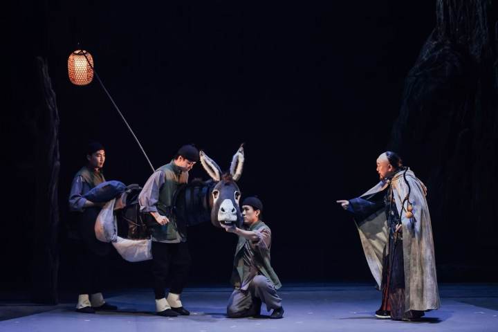 一竹一驴一人,话剧《枝叶关情・郑板桥》以“竹”为精神图腾,将水墨意境、青砖黛瓦等中式美学元素融入舞台,竹影婆娑间尽显东方韵味,方言俚语的点缀更让人物褪去了历史的疏离感。此外,本剧更创新性地加入驴偶“懂事”等木偶戏元素,以“驴”“牛”为意象,将人物的性格外化,体现出郑板桥刚正不阿、不畏强权,心系百姓的的形象。