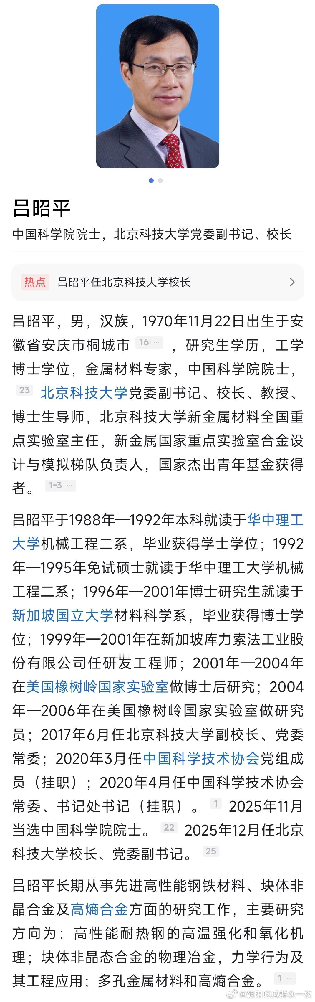 徐晓萍任北京科技大学党委书记,吕昭平任北京科技大学校长、党委副书记。
