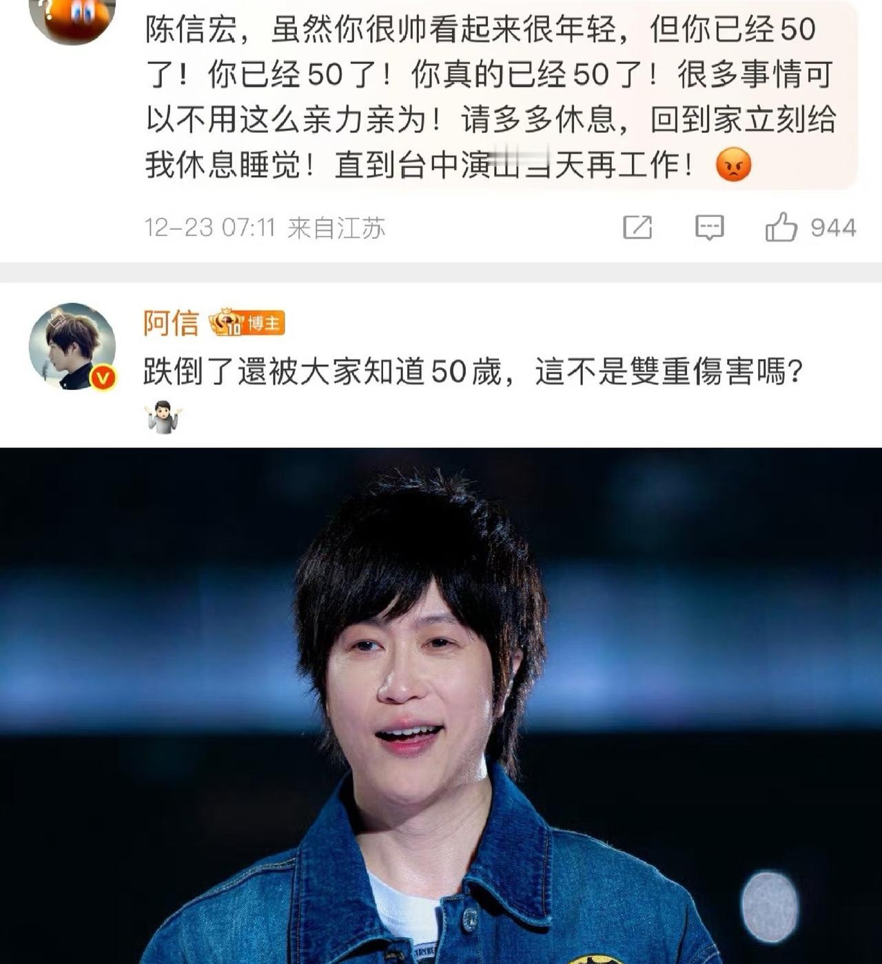 阿信:跌倒了还被大家知道50岁。 要不是这次跌倒谁能想到这是半百的人,老一辈偶