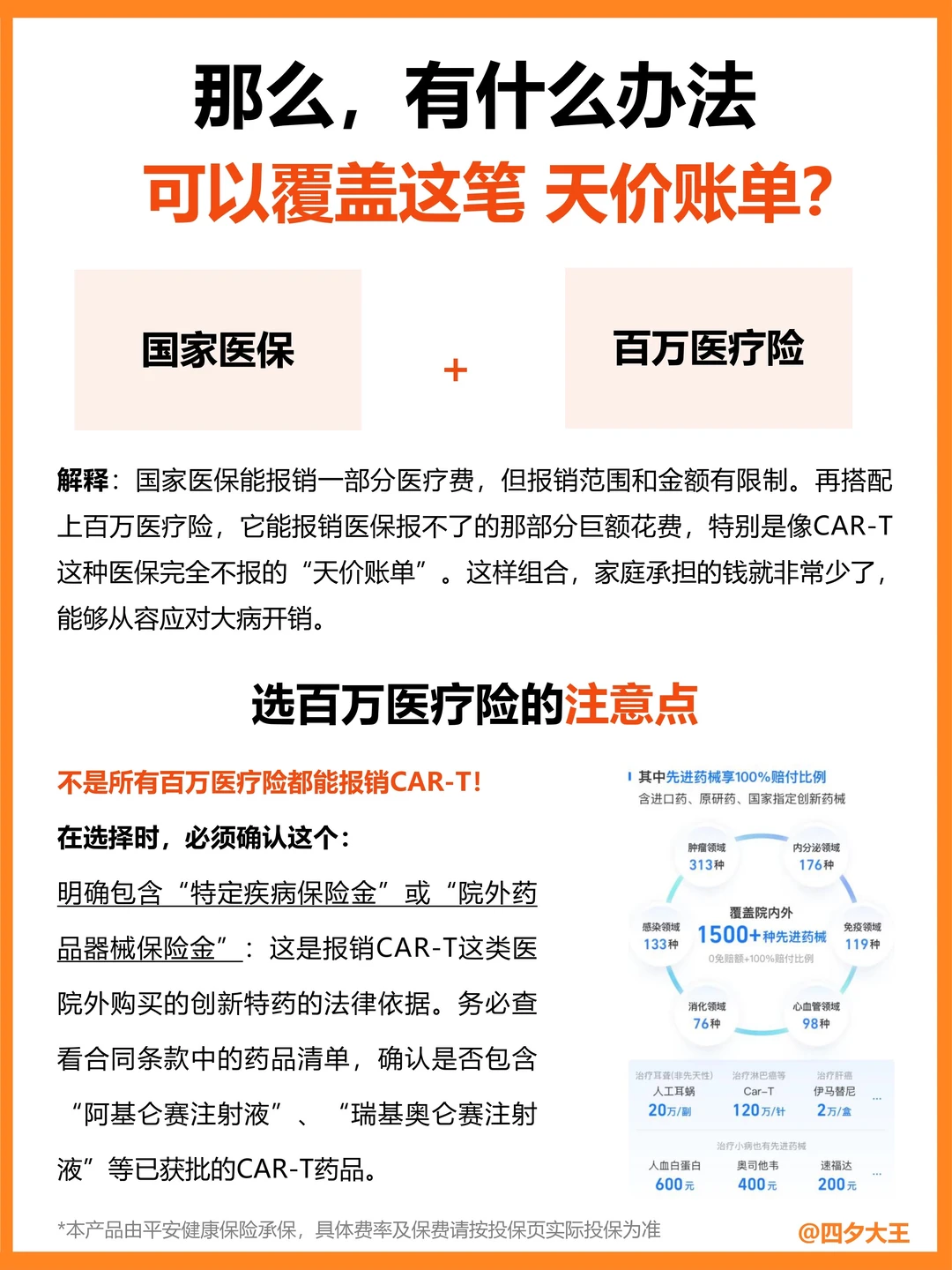 但是!百万医疗不要乱买🖐,必须选带“特定药品责任”的,并确认合同附带的《特药清单》里,包含了CAR-T等昂贵抗癌药。用每年几百上千的保费,撬动几百万的报销额度。