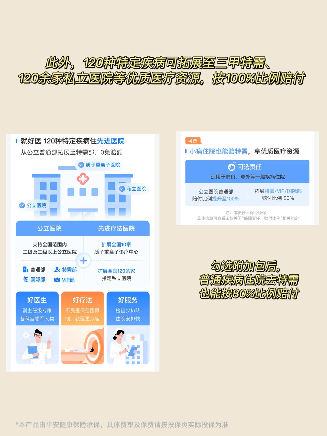 120种特定疾病可拓展至三甲特需、百余家私立医院等优质医疗资源,按100%比例赔付,勾选附加包后,普通疾病住院去特需也能按80%比例赔付