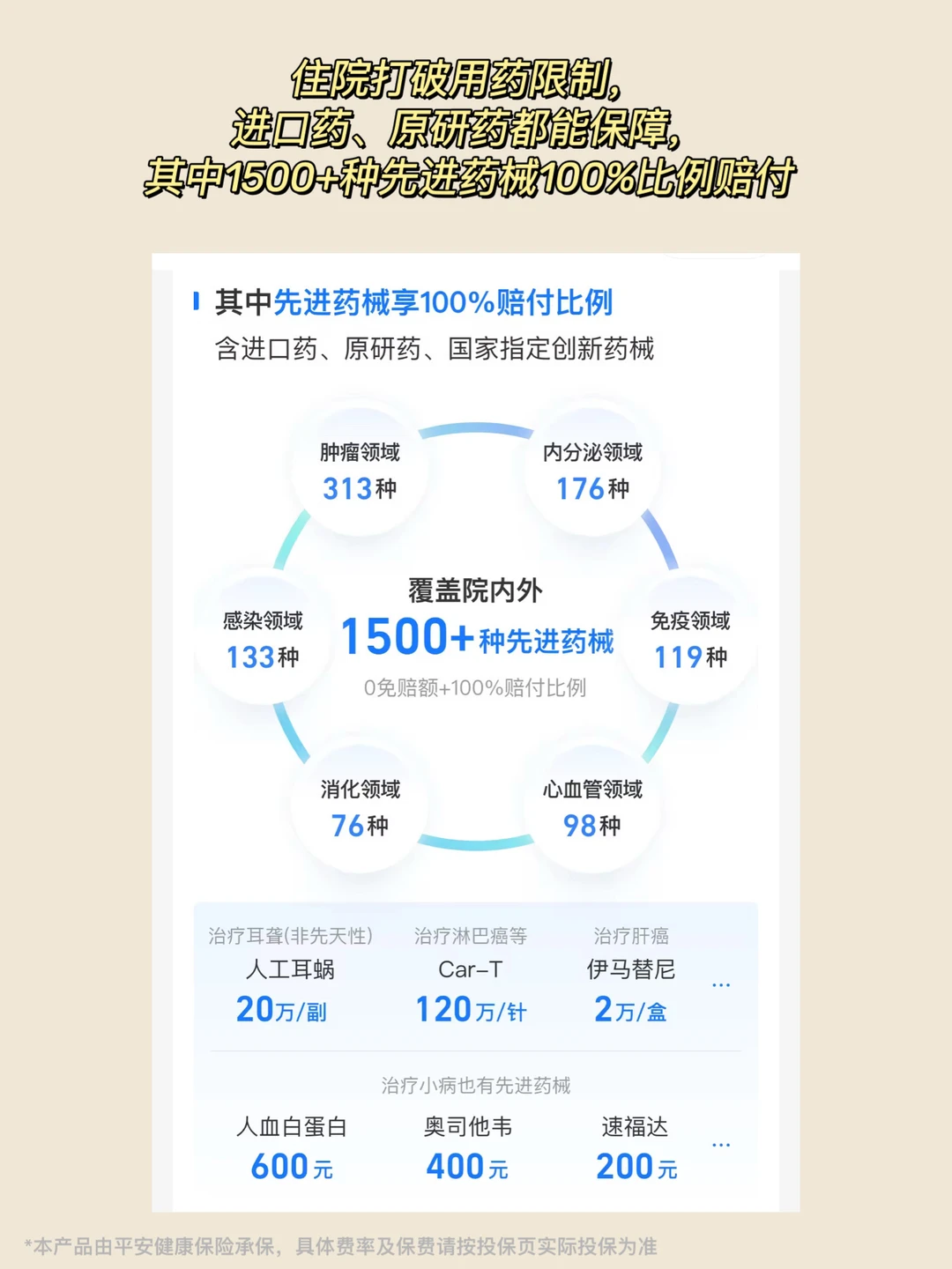 住院打破用药限制,进口药、原研药都能保障,其中1500+种先进药械100%比例赔付;