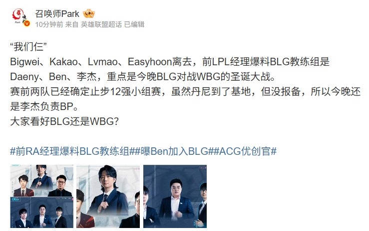 Bigwei、Kakao、Lvmao、Easyhoon离去,前LPL经理爆料BLG教练组是Daeny、Ben、李杰,重点是今晚BLG对战WBG的圣诞大战。