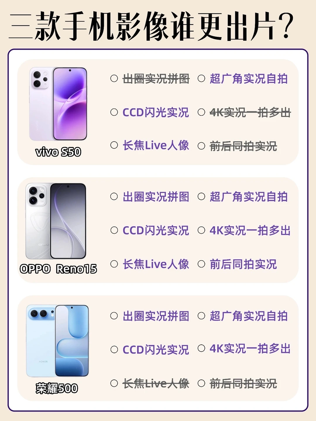 OPPOReno15 vivoS50 荣耀500 中端机推荐 年轻人手机 拍照手机 颜值手机 数码好物 选机指南 实况拍照神器
