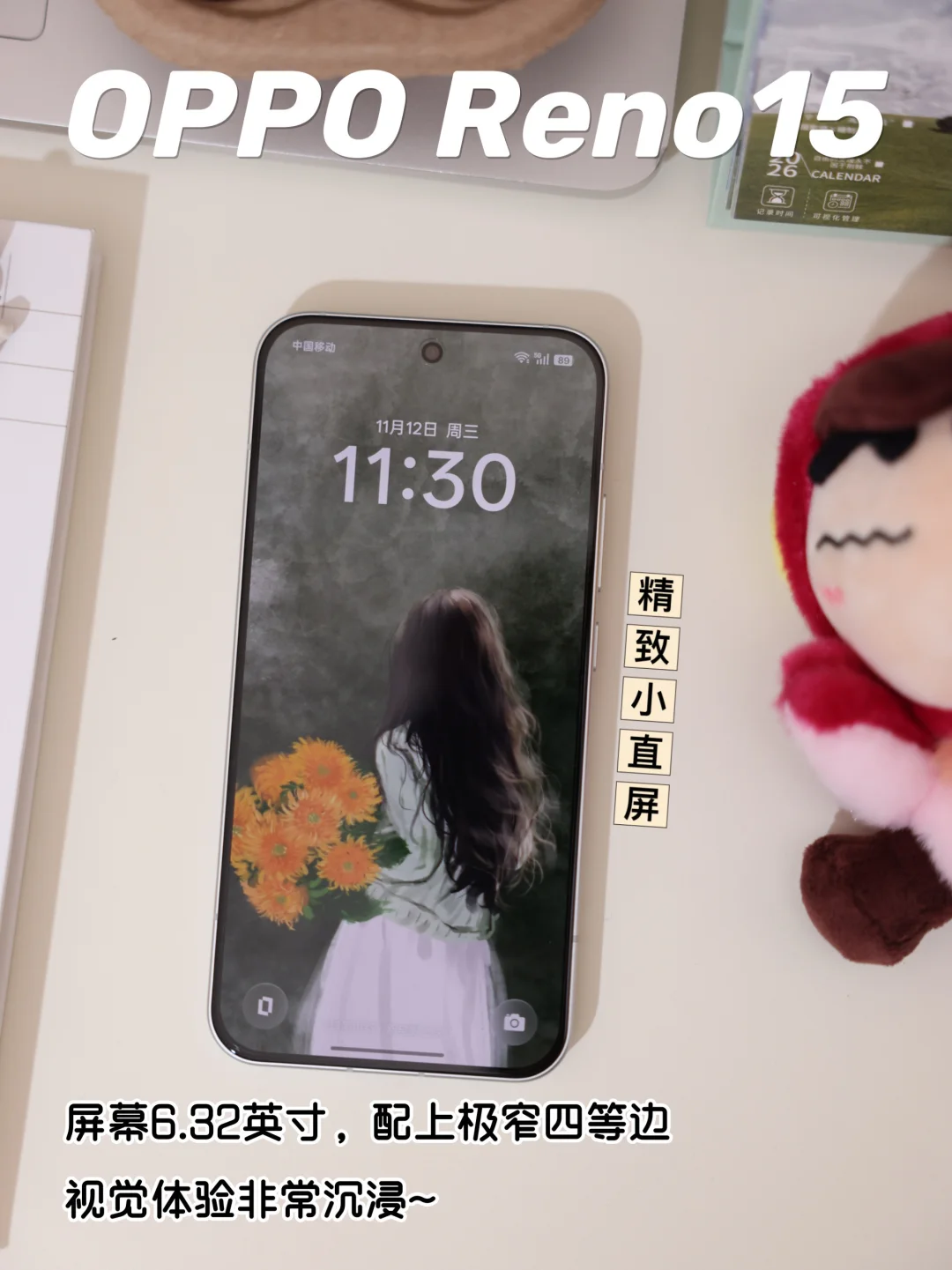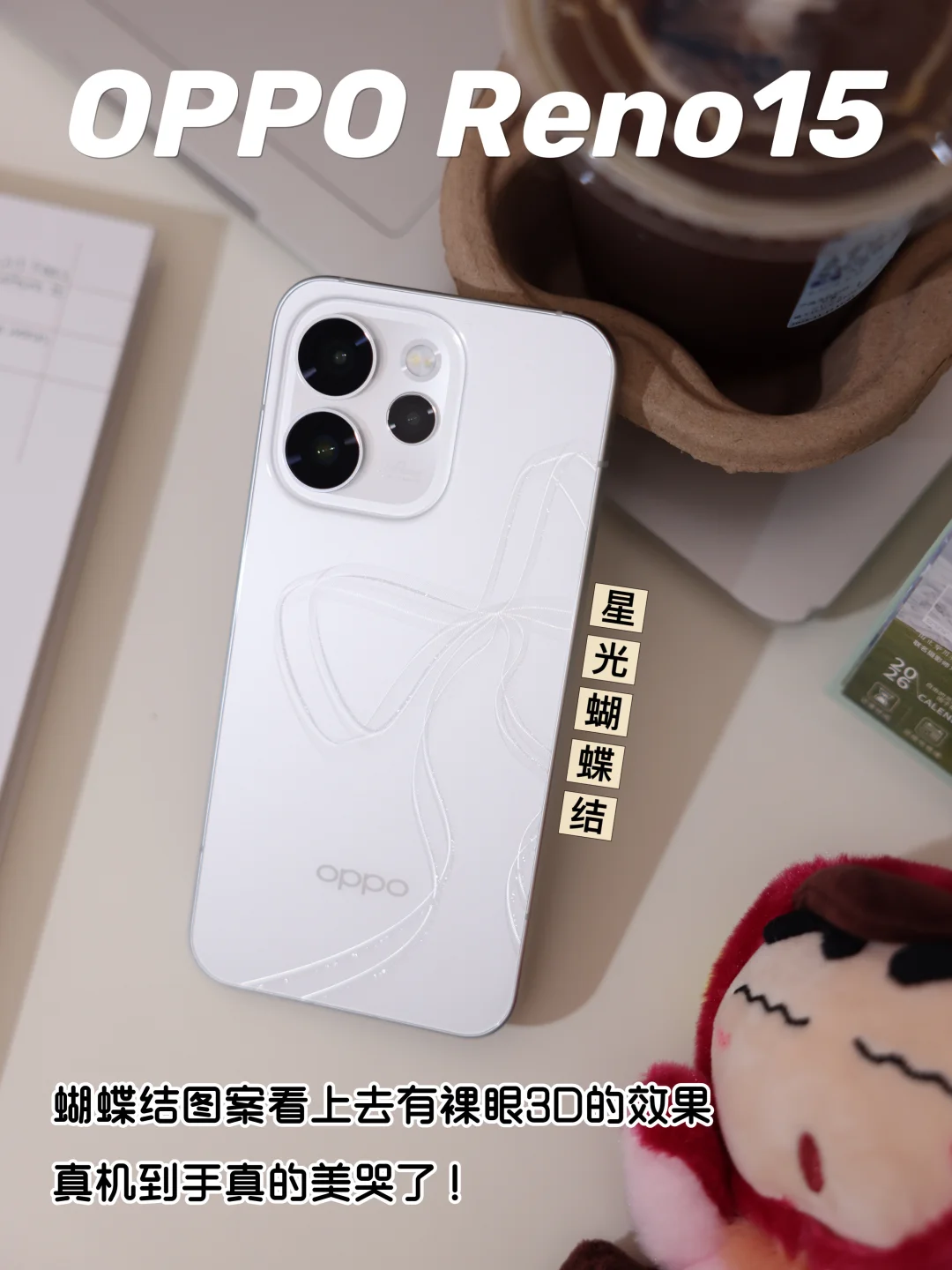 OPPO Reno15是6.32英寸极窄四等边小直屏,视觉体验非常沉浸;187g重量单手掌控无压力,全息光刻背板自带星光细闪,蝴蝶结图案看上去有裸眼3D的效果,潮流感拉满~