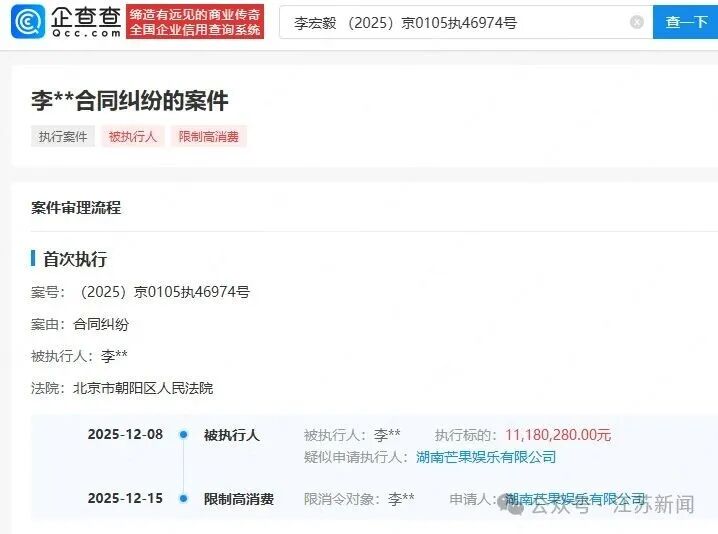 12月25日,话题“李宏毅限高”冲上热搜。据白鹿视频,北京市朝阳区人民法院向李宏毅签发限制消费令,申请人为湖南芒果娱乐有限公司。