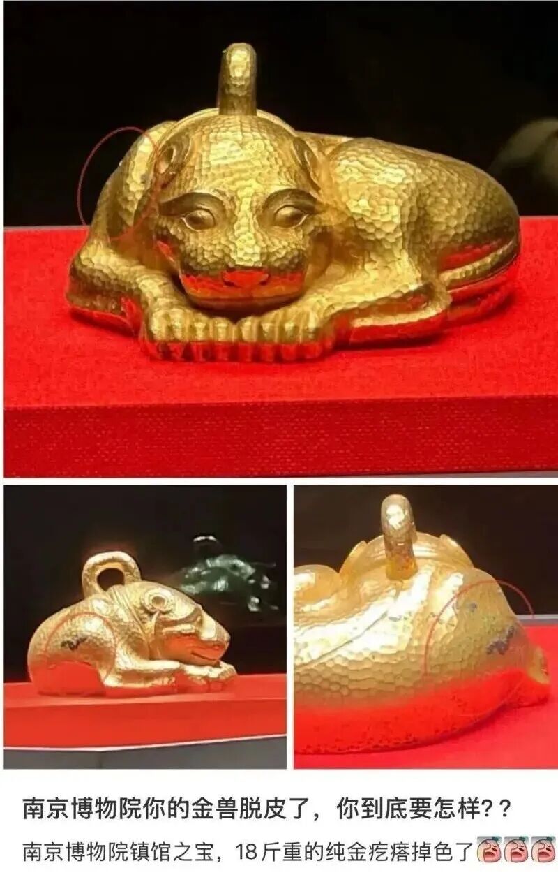 近日,不少网友在社交平台吐槽称,南京博物院镇院之宝,99%含金量的“金兽”掉色了。网帖图片显示,金兽的右腿上方的确有一大块黑斑及小块的绿色斑点。