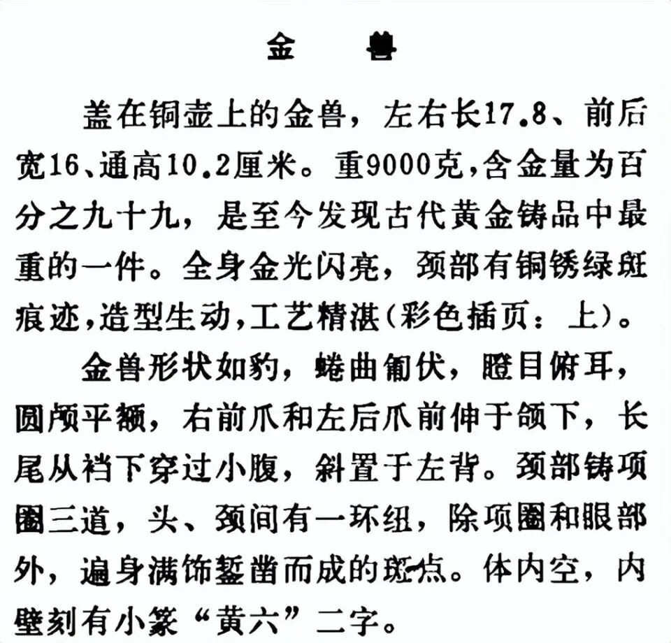 文章在详细介绍“金兽”时亦提及,全身金光闪亮,颈部有铜锈绿斑痕迹,造型生动,工艺精湛。