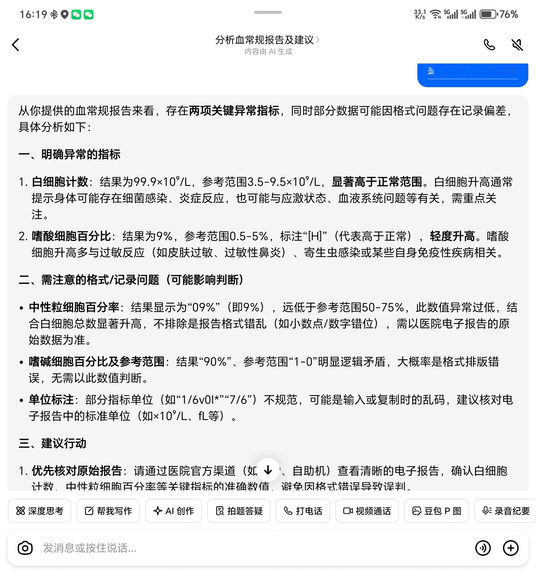 为什么会有体检报告焦虑我爸就是这样一个人,让他定期检查跟要他命似的就是不愿意去。前两年大病一场才知道定期检查的重要性。因为很多病都是拖出来的,及时检查及时了解自己的身体状况,及时调整和改善,可能很多病都会与你无关。现在他不仅养成了定时检查的习惯,有时候还会把检查结果发给AI工具给他分析一下🥹说实话,连我这个年轻人都不一定会想起用AI,没想到他这么时髦😂。他是个内向的人,很少去找人问事情更别说检查结果了😔,现在AI已经非常好用了,不仅能给他分析检查结果,还能告诉他日常饮食需要注意的地方,我也问过医生,现在的AI还挺靠谱的。