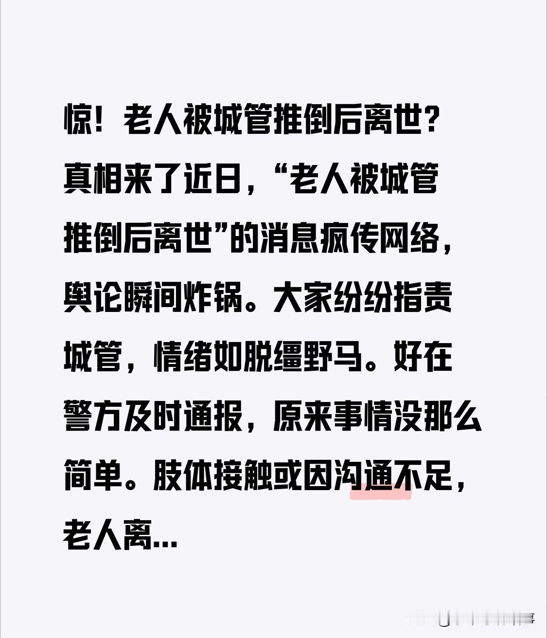 惊!老人被城管推倒后离世?真相揭晓 近日,“老人被城管推倒后离世”消息在网络疯传,舆论瞬间沸腾,众人纷纷指责城管,情绪失控。 所幸警方及时通报,原来事情没那么简单。肢体接触可能源于沟通不畅,老人离世也非单一因素导致。 专家提醒,信息时代需冷静等真相。此事也提醒城管,执法要更具人性化。网民也应理智看待。记住,真相需时间沉淀! 友友们如何看待此事?评论区聊聊老年人离世