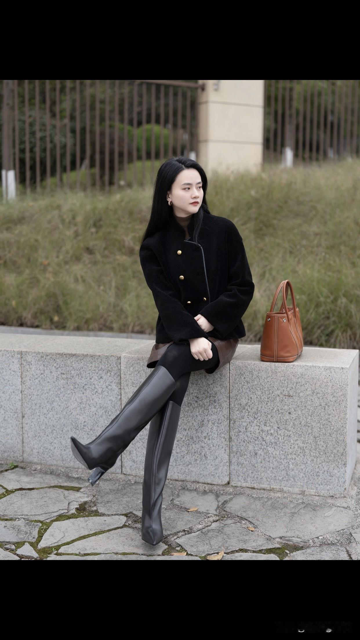 都市时尚里,黑色上衣配牛仔裤,再搭黑色靴子,手拿购物袋,这搭配简直都市感拉满!