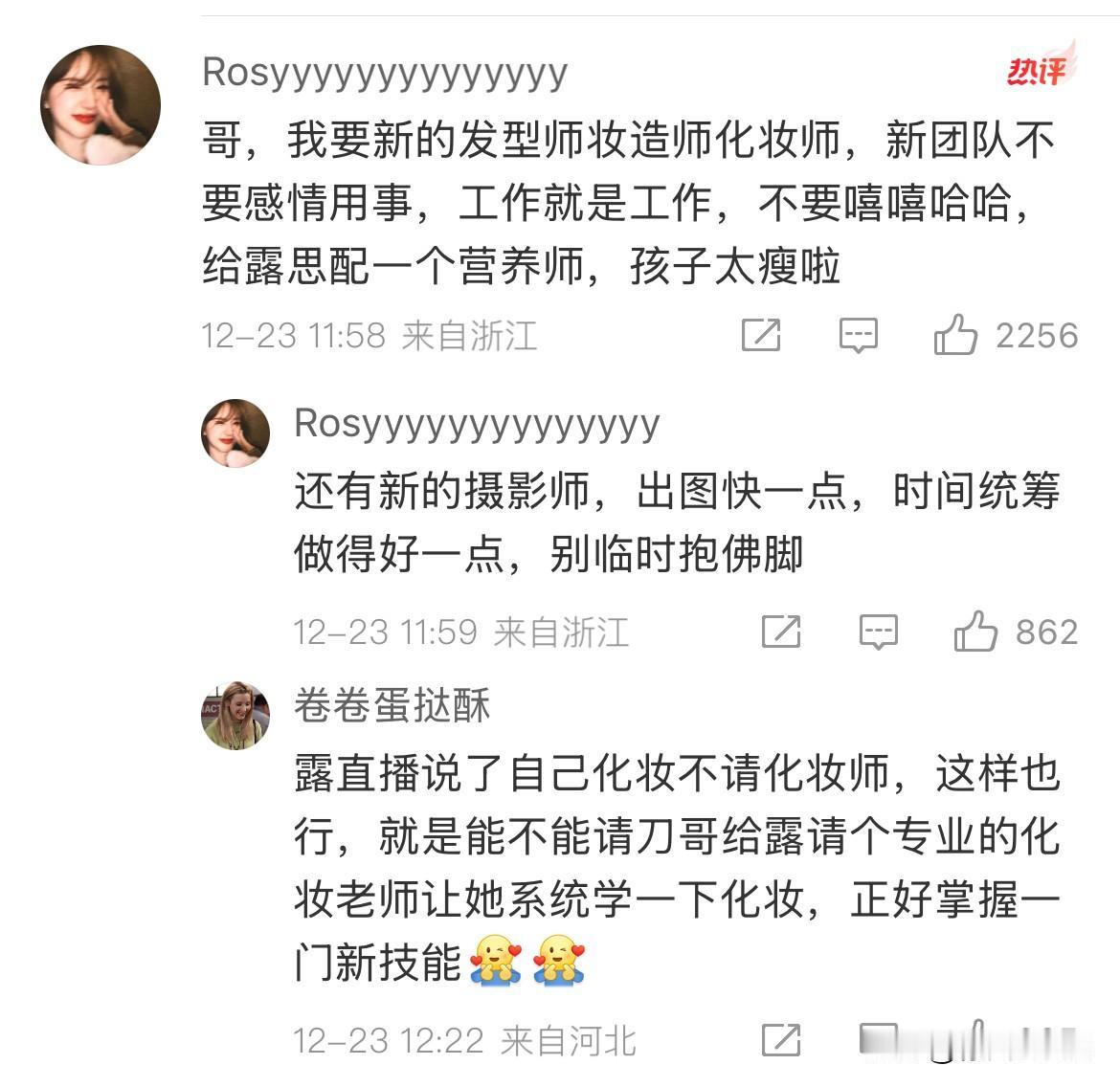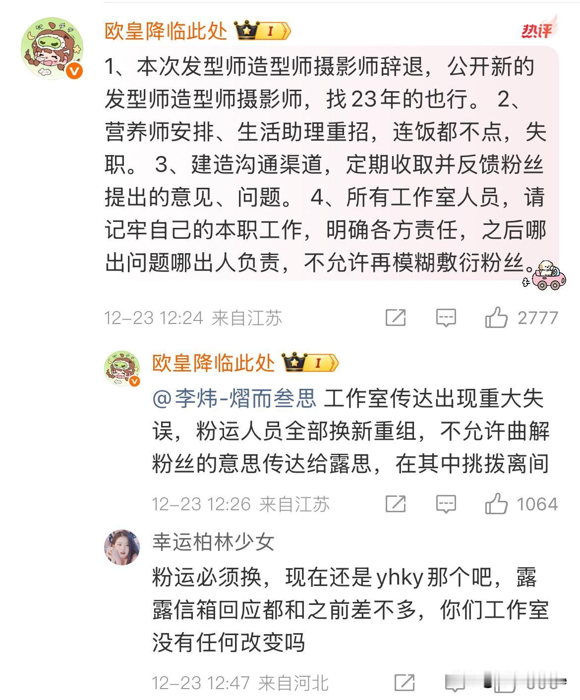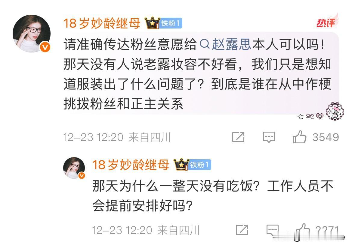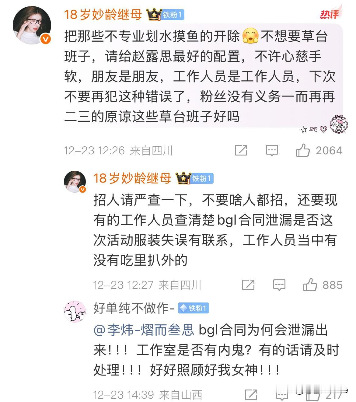 12月25日,赵露思不服软,经纪人服软! 李炜开了🧣,赵露思粉丝让他把这次跟赵露思去星光大赏的工作人员,全都开掉! 赵露思不愿意请化妆师,让他赶紧给赵露思找专业的化妆老师教她化妆! 赵露思粉丝还让50岁的他跟贾士凯学习! 看完有被赵露思粉丝可爱到!🍠没法直接跟赵露思说的话,🧣一整个畅所欲言,从妆造,礼服到身边的工作人员,所谓的好朋友,能指出问题的全都说了一遍,提了一遍建议,我看了都很诚恳,都是为了赵露思好,就不知道真正采纳,能做到那些……