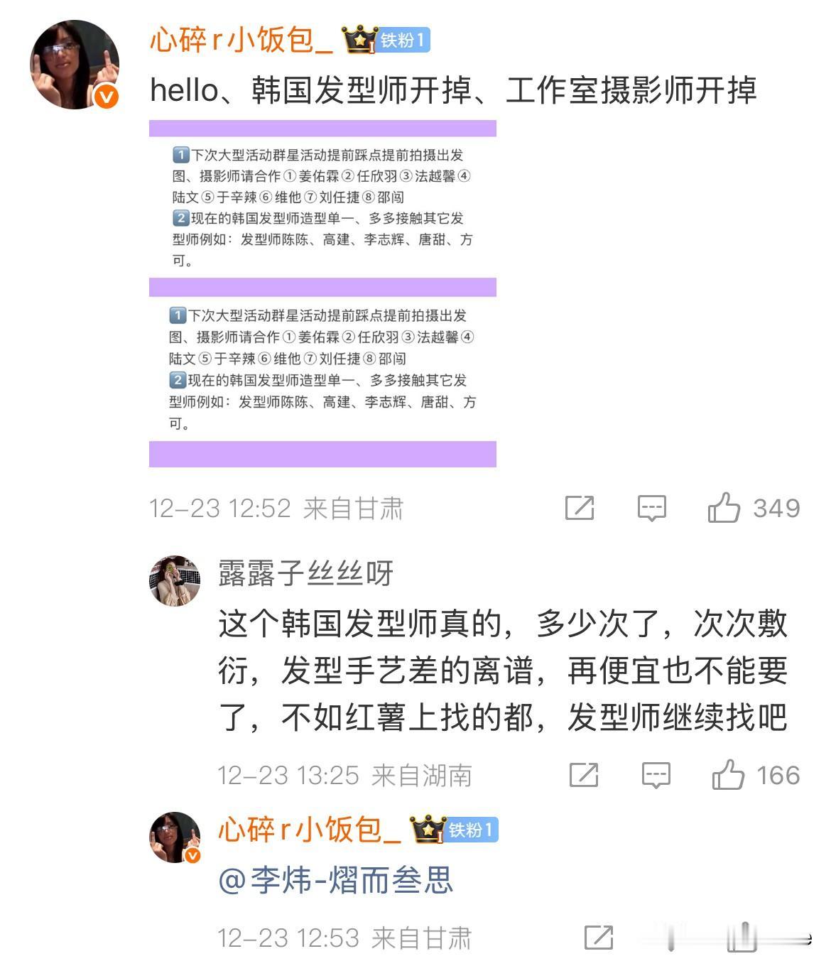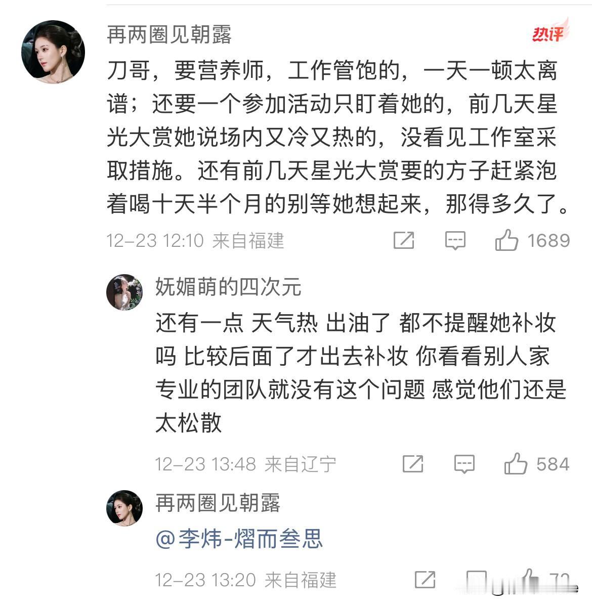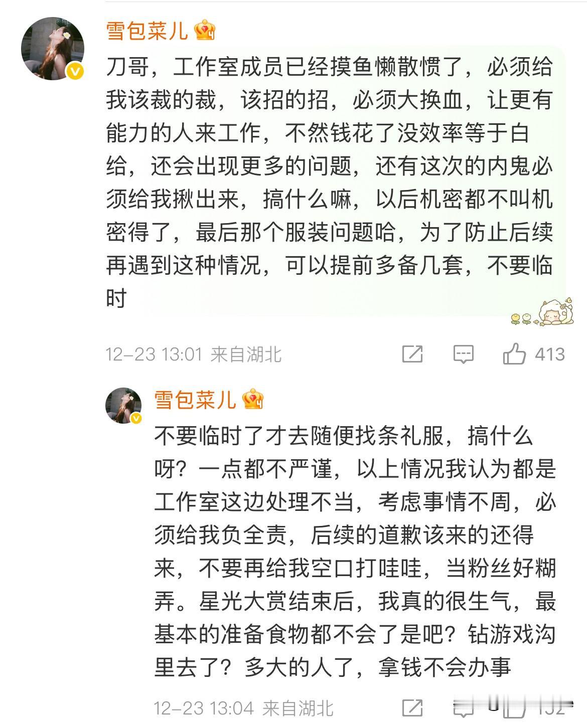12月25日,赵露思不服软,经纪人服软! 李炜开了🧣,赵露思粉丝让他把这次跟赵露思去星光大赏的工作人员,全都开掉! 赵露思不愿意请化妆师,让他赶紧给赵露思找专业的化妆老师教她化妆! 赵露思粉丝还让50岁的他跟贾士凯学习! 看完有被赵露思粉丝可爱到!🍠没法直接跟赵露思说的话,🧣一整个畅所欲言,从妆造,礼服到身边的工作人员,所谓的好朋友,能指出问题的全都说了一遍,提了一遍建议,我看了都很诚恳,都是为了赵露思好,就不知道真正采纳,能做到那些……
