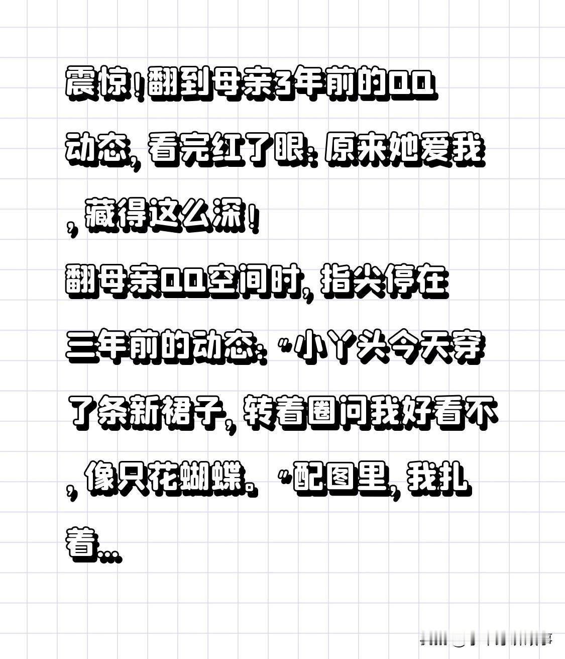 震惊!翻到母亲3年前的QQ动态,看完红了眼:原来她爱我,藏得这么深! 翻母亲QQ空间时,指尖停在三年前的动态:"小丫头今天穿了条新裙子,转着圈问我好看不,像只花蝴蝶。"配图里,我扎着歪歪扭扭的辫子,裙摆扫过镜头。 往下滑,高考失利那天,她发了张厨房照片:"炖了银耳汤,放了冰糖,等她出来喝。"原来我锁在房里哭时,她在厨房站了整整两小时。 最新一条是去年生日:"丫头说要带男友回家,买了条鱼,记得他爱吃清蒸的。" 突然懂了,父母的爱从不是轰轰烈烈,而是藏在这些细碎的记录里,像冬日暖阳,不刺眼,却足够暖透一生。 友友们,看完这篇文章,你们有什么要说的吗?评论区聊聊