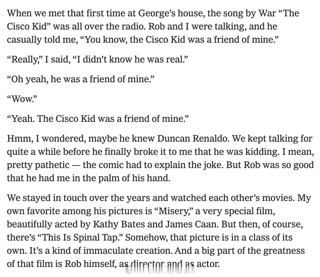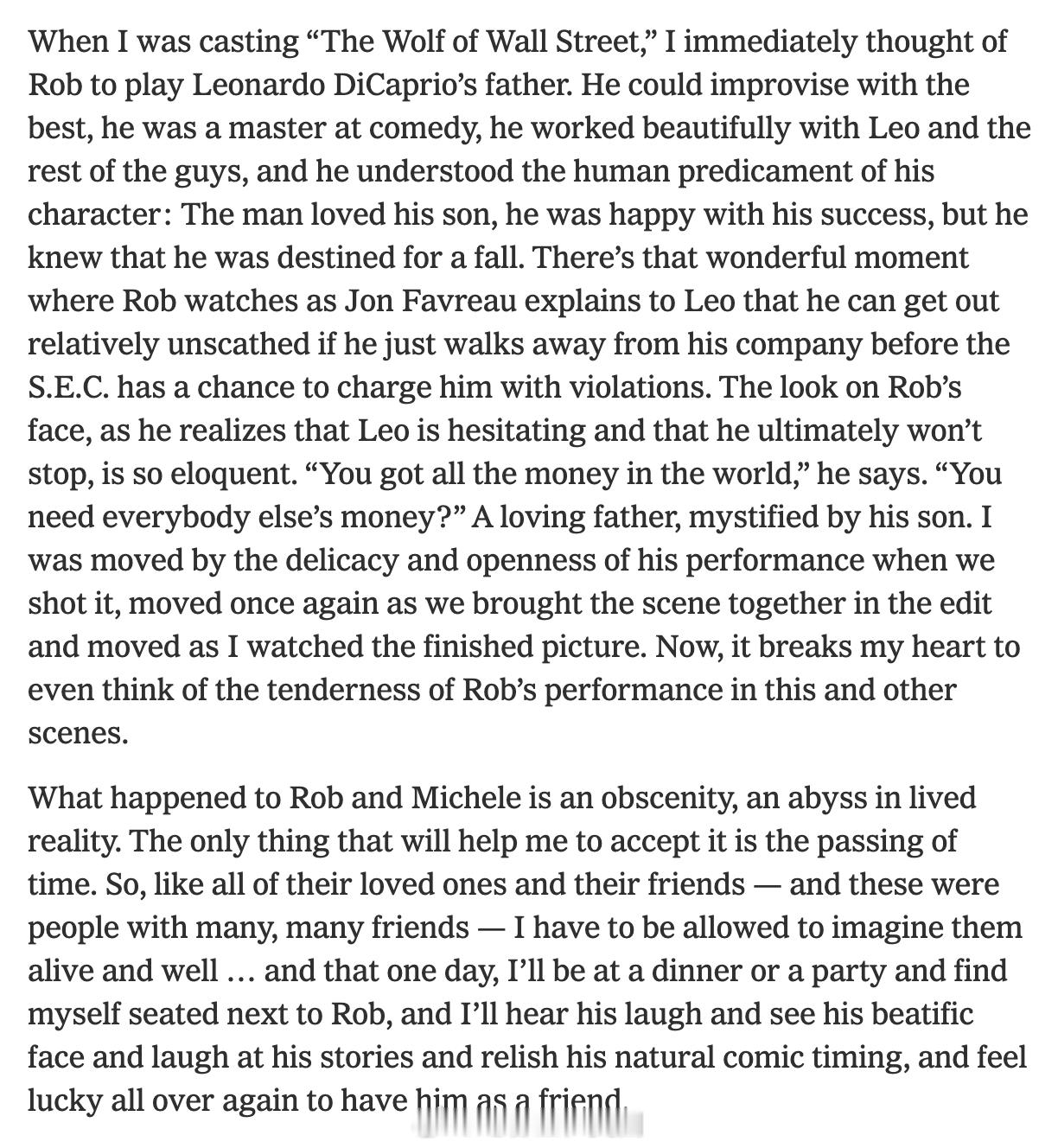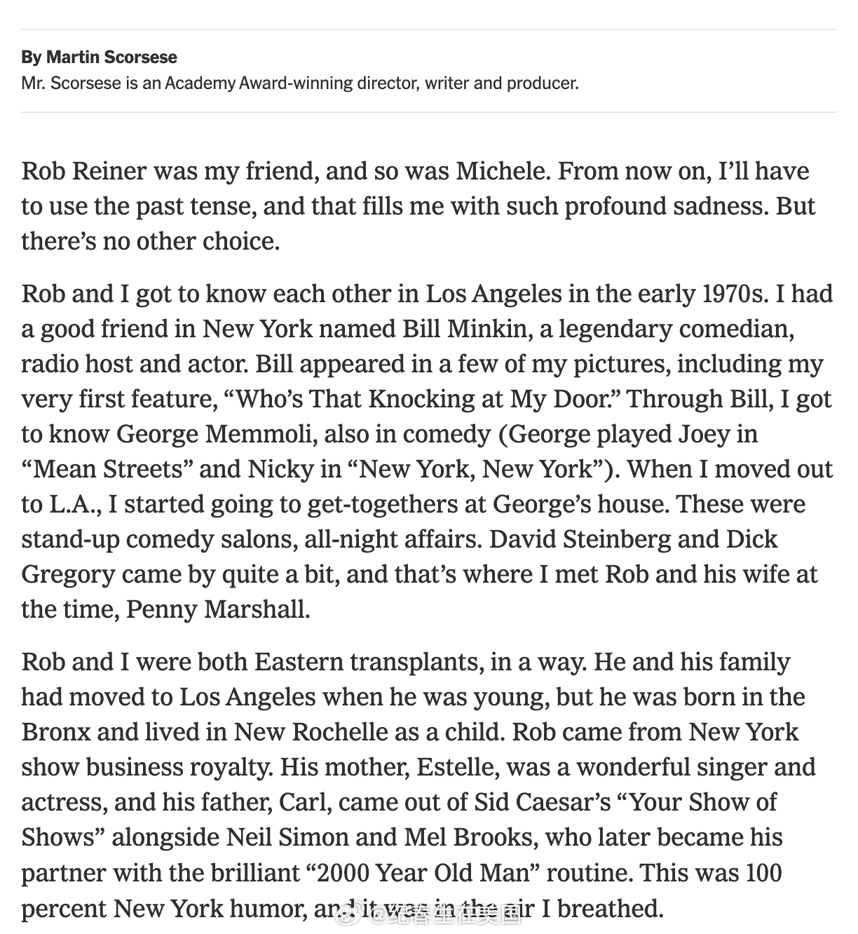 马丁·斯科塞斯圣诞节当天在上发文:“我的挚友Rob Reiner”:Rob Reiner 是我的朋友,Michele 也是。从现在起,我不得不改用过去时来称呼他,这让我感到深切的悲哀。但别无他选。我和 Rob 是在 20 世纪 70 年代初的洛杉矶结识的。我在纽约有个好朋友叫 Bill Minkin,他是一位传奇喜剧演员、电台主持人和演员。Bill 出演过我的几部电影,包括我的处女作“谁在敲我的门” 。通过 Bill,我认识了同样从事喜剧工作的 George Memmoli(George 在“穷街陋巷 ” 中饰演 Joey,在 “ 纽约,纽约” 中饰演 Nicky)。搬到洛杉矶后,我开始参加在 George 家举行的聚会。那简直是站立喜剧的沙龙,常常通宵达旦。David Steinberg 和 Dick Gregory 经常光顾,也是在那里,我遇到了 Rob 和他当时的女友 Penny Marshall。从某种意义上说,我和 Rob 都是“东部移民”。虽然他年轻时随家人搬到了洛杉矶,但他出生在布朗克斯,童年是在新罗谢尔度过的。Rob 出身于纽约演艺名门:他的母亲 Estelle 是一位出色的歌手和演员;他的父亲 Carl 曾与 Neil Simon、Mel Brooks 一同出演 Sid Caesar 的“演艺船” ,后来 Carl 还与 Mel Brooks 合作了经典的喜剧“二千岁老人” 。这种纯正的纽约式幽默,是我从小到大呼吸的空气。当时那个圈子里有几个不同的即兴表演团体。George 的团队成员包括 Bill Saluga、Michael Mislove、Patti Deutsch 和 Fred Willard,名叫 Ace Trucking Company。而 Rob 则更多地与 Credibility Gap 联系在一起,他们是另类广播电台的讽刺作家,带有鲜明的政治和反主流文化色彩。为了让你了解他们的风格,他们曾做过一档节目,题目就叫“ 胡佛:生亦何欢,死亦何哀” 。Michael McKean、Harry Shearer 和 Albert Brooks 也是那个圈子的一员。我立刻就喜欢上了和 Rob 待在一起。我们之间有一种天然的亲近感。他风趣幽默,有时甚至词锋犀利,但他绝不是那种爱在房间里抢风头的人。他拥有一种美妙而无拘无束的自由感,全身心地享受当下的生活,而且他有一副洪亮的嗓子。当他在林肯中心接受表彰时,Michael McKean 做了一段表演,那是对庄重官方致辞的精彩模仿。在包袱抖出来之前,Rob 的笑声就已经响彻了整个礼堂。第一次在 George 家见面时,电台里到处都在放 War 乐队的那首 。我和 Rob 聊天时,他随口对我说道:“你知道吗,The Cisco Kid 曾是我的朋友。”“真的吗?”我说,“我以前都不知道那是确有其人。”“哦,是真的,他是我朋友。”“哇。”“是啊。The Cisco Kid曾是我的朋友。”我当时还在琢磨,或许他认识 Duncan Renaldo。我们聊了好一会儿,最后他终于向我坦白他在开玩笑。我是说,这太差劲了——喜剧演员居然还得亲自解释笑话。但 Rob 演得太逼真了,以至于我完全被他玩弄于股掌之间。这些年来我们一直保持联系,互相观看对方的作品。在他执导的影片中,我个人最喜欢的是 “ 危情十日”,那是一部非常特别的电影,Kathy Bates 和 James Caan 的表演极佳。当然,还有“ 摇滚万万岁” 。不知为何,那部电影自成一派,简直是神来之笔。而这部电影的伟大之处,很大程度上归功于 Rob 本人,无论是作为导演还是演员。在筹备“ 华尔街之狼” 的选角时,我立刻想到了让 Rob 来扮演 Leonardo DiCaprio 的父亲。他擅长即兴发挥,是喜剧大师,与 Leo 以及其他演员合作得非常默契。他深刻理解角色所处的困境:这个男人爱他的儿子,为儿子的成功感到高兴,但他清楚儿子注定会摔得很惨。片中有一个精彩瞬间:Jon Favreau 正在向 Leo 解释,如果能在美国证券交易委员会指控违规之前撤出公司,他就能相对体面地脱身。Rob 当时的神情非常传神,他意识到 Leo 在犹豫,且最终不会收手。“你已经有了全世界所有的钱,”他说,“你还想要别人的钱吗?”这是一个爱子心切却又对儿子感到困惑的父亲。拍摄那一幕时,我被他表演中的细腻和坦诚所打动;在剪辑过程中,我再次被打动;看成片时依然如故。现在,一想到 Rob 在那场戏以及其他片段中流露出的温柔,我便心碎不已。Rob 和 Michele 的遭遇是一桩惨剧,是现实生活中的一个深渊。唯有时间的流逝能帮我接受这一切。因此,就像他们所有的至爱亲朋一样——由于他们广结善缘,这样的朋友有很多——我必须允许自己想象他们依然安好……想象某天在晚宴或聚会上,我发现自己恰好坐在 Rob 身边,再次听到他的笑声,看到他那和蔼的面庞,听他讲故事,品味他天生的喜剧节奏,并再次庆幸能拥有他这样一位朋友。