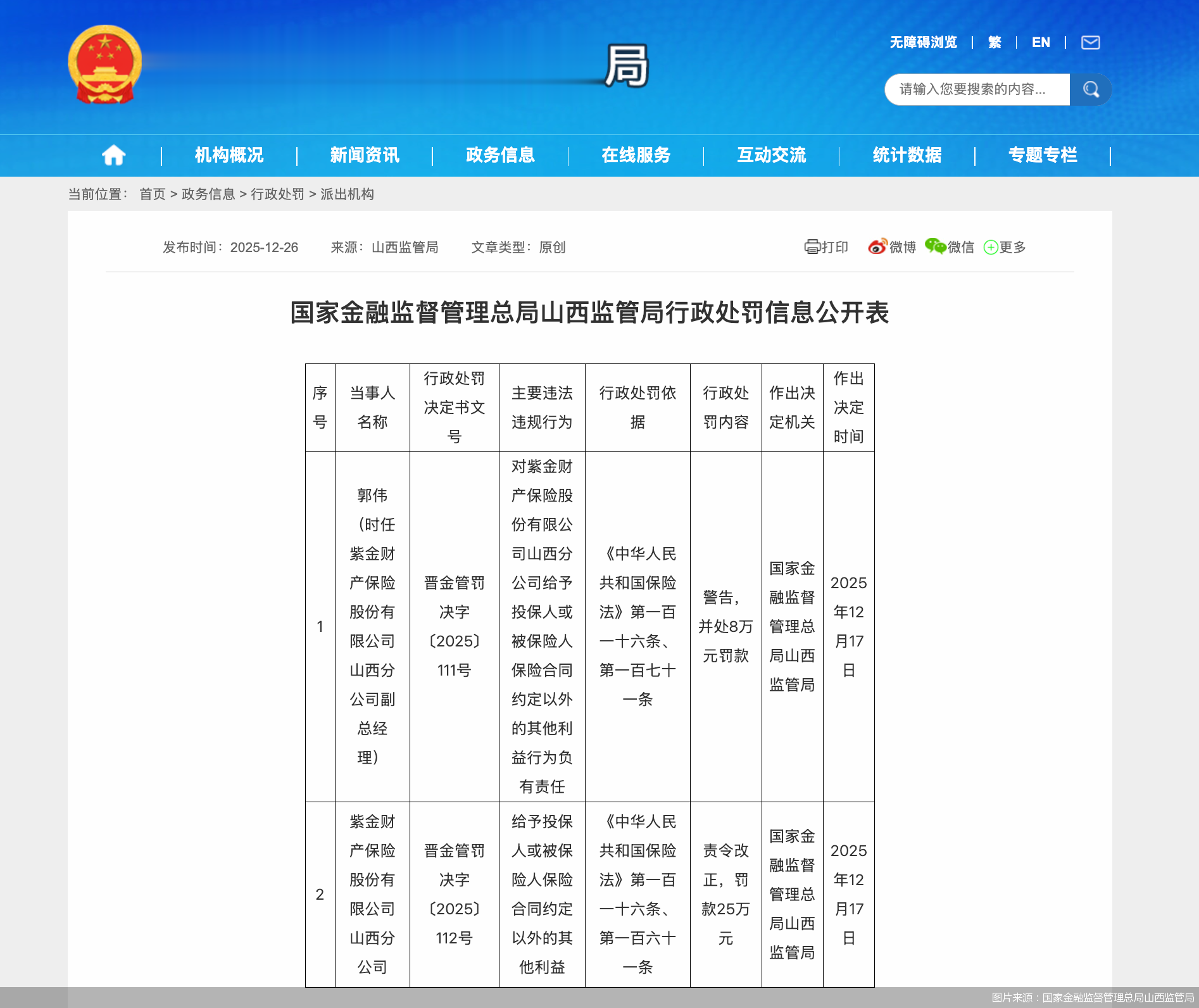 北京商报讯(记者胡永新)12月26日,国家金融监督管理总局山西监管局发布的行政处罚信息显示,紫金财产保险股份有限公司山西分公司因给予投保人或被保险人保险合同约定以外的其他利益,被责令改正,罚款25万元。时任该公司副总经理郭伟被警告,并处8万元罚款。