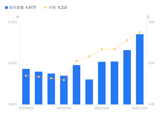 日期A股户数(户)流通A股户均持股数(股)户均持股市值(万元)2025-12-194968411302.2410.412025-12-104658512054.1010.732025-11-284436112658.4210.842025-11-204430912412.2910.612025-11-104086613458.0411.132025-10-314368112590.7410.192025-10-204160613218.689.722025-09-304200913091.879.712025-09-194240212970.889.702025-09-104292712812.259.63