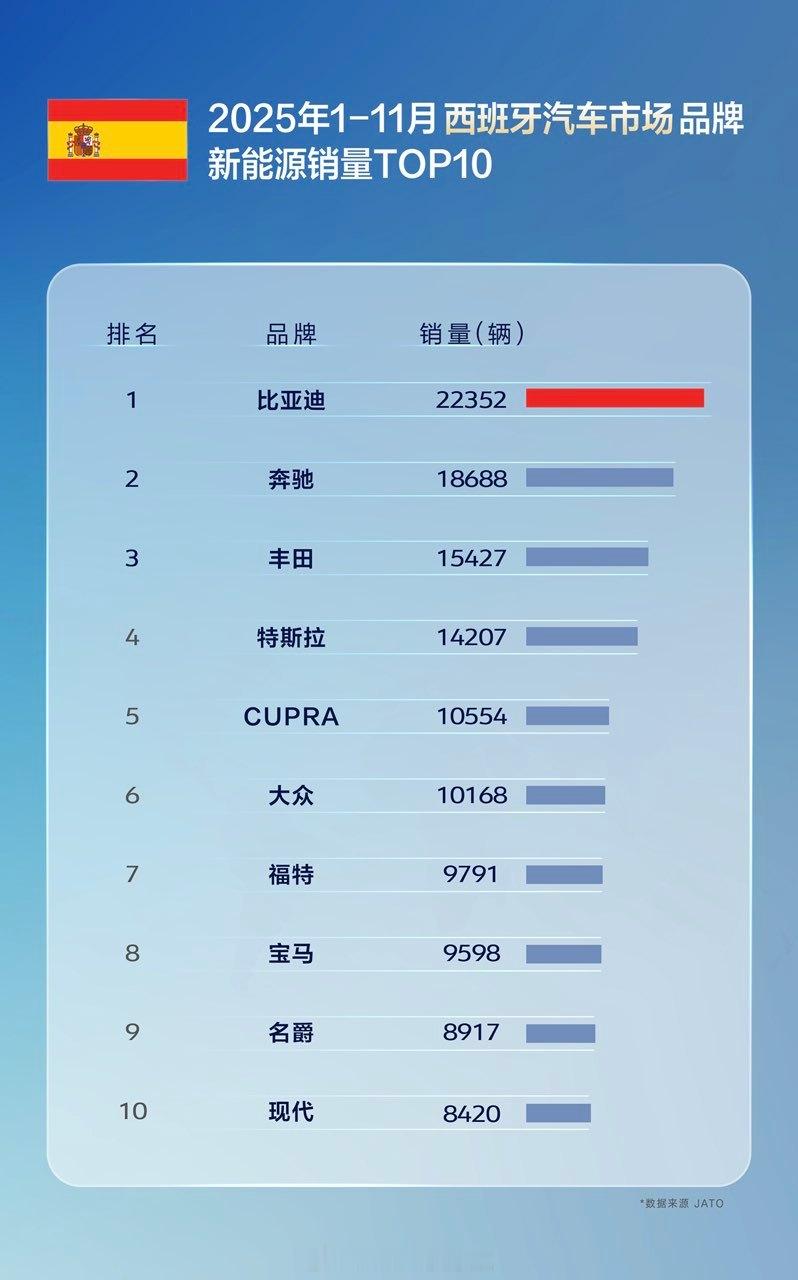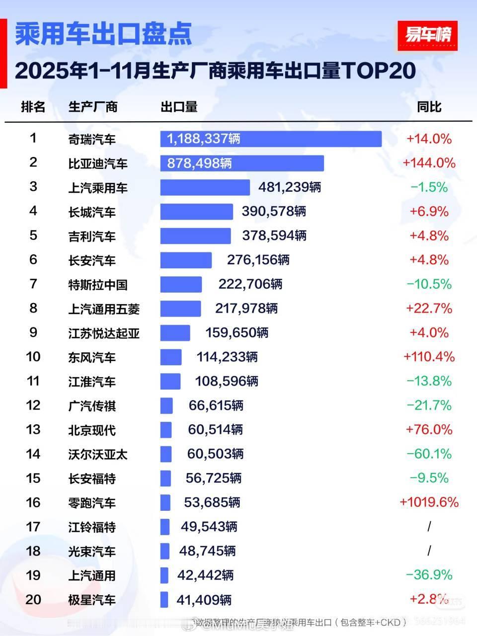 还有几天2025年就结束了~回顾下今年车圈国内乘用车的成绩最亮眼的毋庸置疑还是迪迪,出口方面迪迪也是最早的,今年的成长也是最快的,2025年11月啊迪出口量12.8万台,同比增长313.4%;今年1-11月累计出口87.8万台,同比增长144%,跟24全年总出口量比已翻倍增长了~其中,在中国、新加坡、泰国、英国、德国、意大利、西班牙、奥地利、爱尔兰、马来西亚、土耳其等11个汽车核心国家市场,销量已经全面超越特斯拉。特别在新加坡,上个月我才说在当地能见度,随便一个街角都能看到一台比亚迪,属于新能源销冠在当地市场的具象化体现了,大家怎么看迪子的产品在海外市场的表现呢?多国销冠全面超越汽场全开