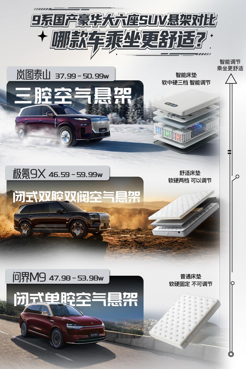 最近看 9 系国产大六座 SUV,发现悬架直接拉开乘坐体验差距!用床垫类比真的秒懂👇