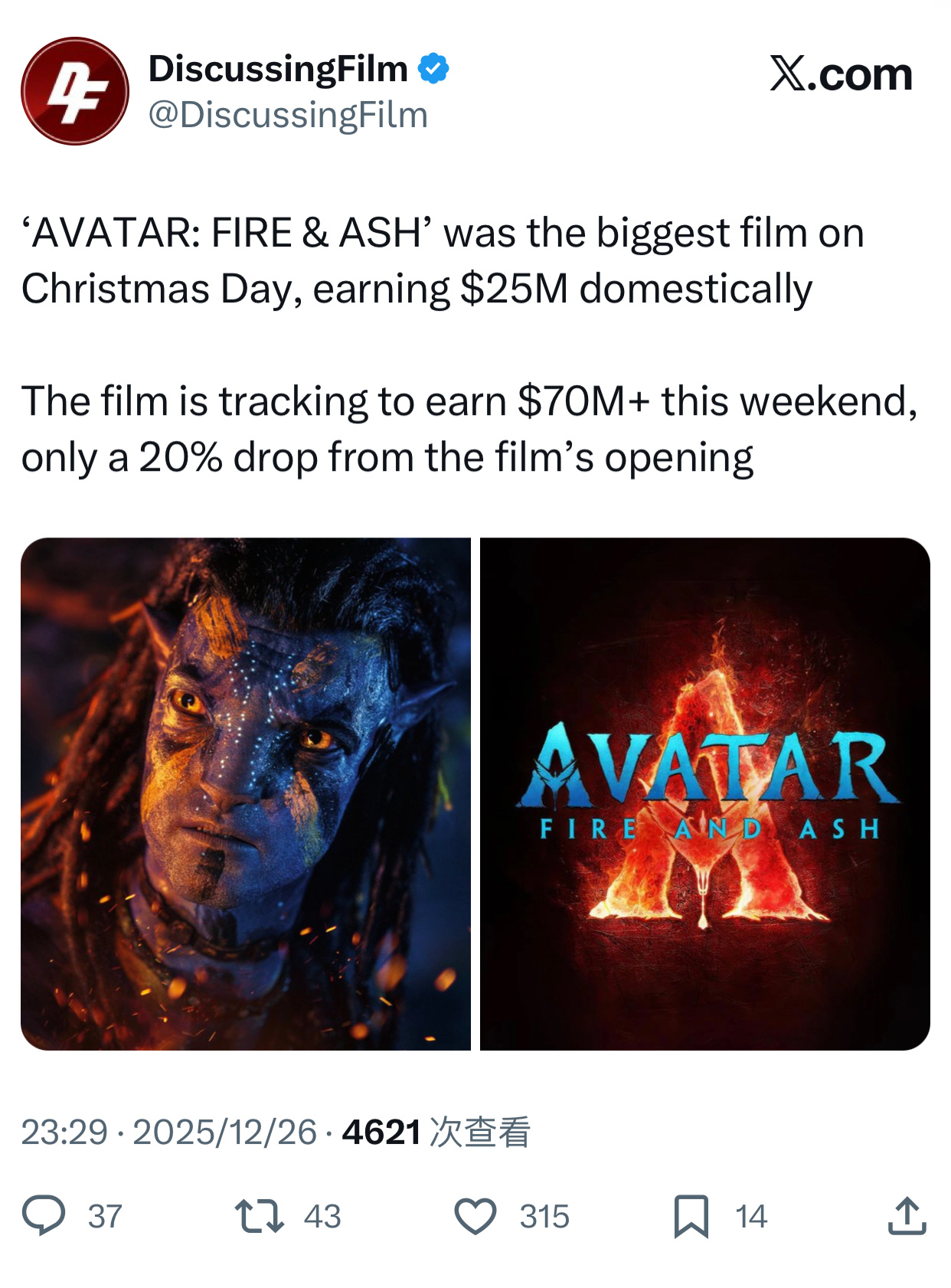 2025年第51周北美票房:1.《阿凡达3》开画夺冠,成绩不算突出,跟前作比首