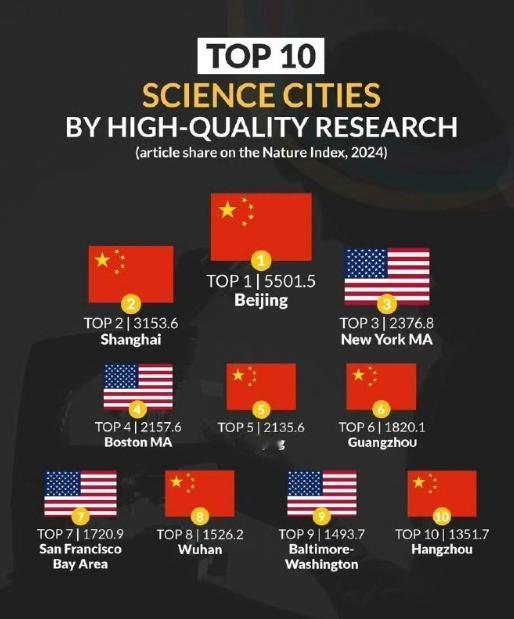 喜讯! 中美霸榜全球十大科研城,东京伦敦出局,中国六席领跑! 最近,《自然》杂志旗下“自然指数”发布了一项关于全球科研产出的城市排名。结果令人意外又不意外:全球科研实力最强的十座城市,全部集中在美国和中国——中国占了六席,美国占四席;更值得注意的是,前两名居然都是中国城市。 先说这榜单的含金量,可不是随便排排玩的。 它只看实打实的硬数据,统计的是2023年在82种高质量自然科学期刊上发表的论文贡献,这些期刊都是全球顶尖科学家选出来的,能在上面发文章,那都是真材实料的研究成果。 不像有些排名,掺杂着什么声誉、师生比,甚至国际化程度这些模糊指标,水分大得很。 而自然指数的排名,拼的就是论文的数量和质量,谁的科研产出硬,谁就站得稳,这才是真刀真枪的实力比拼。 其实北京自2016年以来就牢牢霸占全球第一的宝座,2023到2024年的科研产出增幅又超过了9%,把优势越拉越大;上海紧随其后稳居第二,增幅更是逼近20%,势头猛得很 。 再往下数,南京、广州、武汉、杭州这四座中国城市也齐刷刷挤进前十,其中杭州更是从第十三名直接冲进前十! 美国的纽约都市圈、波士顿都市圈、旧金山湾区、巴尔的摩-华盛顿都市圈占了剩下的四席,但有意思的是,这些美国城市的科研份额同期都在下滑,跟中国城市的逆势上涨形成了鲜明对比 。 以前咱们总听说东京的科技多厉害,伦敦的科研多顶尖,可这次它们是真的跟不上趟了。 就说东京,曾经也是亚洲科研的标杆,可近几年在自然指数中的排名一路下滑,2023年连前十都没进去,核心原因就是科研产出增速放缓,2022年高质量论文增速才3%,而咱们深圳的增速高达33%,广州、西安的增幅也都接近30%。 伦敦的情况也类似,虽然在有些综合创新指数里还能看到它的影子,但单论硬邦邦的科研产出,已经被中美城市远远甩在了身后,这背后是欧美老牌科研城市的创新动力不足,而中美尤其是中国,正处在科研爆发的黄金期。 对比一下国外的情况,其实更能看出咱们的优势。 曾经的科研强城波士顿,虽然在生命科学领域还保持着领先,但整体增速放缓,而且缺乏像中国这样大规模的大科学装置集群和完整的创新生态链。日本的东京虽然科研基础雄厚,但受限于产业结构和投入力度,很难再有爆发式增长。 而咱们中国,不仅有北京、上海这样的头部科研城市领跑,还有南京、武汉、杭州、合肥等一批省会城市跟上来,形成了“多点开花、全面崛起”的格局,全国已经有10个城市跻身全球科研城市前20位,比去年还多了两个。 更值得骄傲的是,中国城市在多个学科领域已经形成了碾压式优势。在化学领域,中国城市首次包揽了全球前十,北京、上海、南京稳稳占据前三;在物理科学和地球与环境科学领域,中国城市也各占六席,北京在这三个领域都高居全球第一 。 以前咱们总说在高端科研领域被“卡脖子”,可现在看,在自然指数追踪的大多数学科里,咱们不是在追赶,而是在领跑,这种变化实实在在,骗不了人。 当然,咱们也得清醒看待差距。有数据显示,中国城市的论文在国际引用率上还不如美国和欧洲城市,部分领域的顶尖成果影响力还有提升空间 。 但话又说回来,短短十几年时间,咱们从科研跟跑者变成并跑者,甚至在不少领域成为领跑者,这样的速度已经创造了奇迹。 要知道,美国、日本发展科研用了几十年上百年,而咱们只用了短短几十年就实现了弯道超车,这背后靠的是国家对科研的持续投入,靠的是科研人员的埋头苦干,靠的是“产学研用”一体化的创新生态。 说到底,这份全球科研城市排名,本质上是全球科技实力格局的一次重新洗牌。中美霸榜、东京伦敦出局,不是因为别人退步了,而是因为咱们进步太快了。 以前西方总拿着科技霸权对咱们指手画脚,可现在,咱们用一篇篇高质量论文、一个个重大科研突破,证明了中国的科技实力。 这种实力不是吹出来的,是在北京的实验室里、在上海的科创园里、在深圳的工厂里,一点点干出来的。 未来的全球科技竞争,只会越来越激烈,但这份榜单让我们看到了底气和信心。 中国城市的科研崛起,不是单一城市的胜利,而是整个国家创新体系的成功。相信随着更多大科学装置的落地、更多科研人才的集聚、更多创新政策的支持,咱们还会有更多城市冲进全球科研前列,在更多核心技术领域实现自主可控。 到那时候,咱们的科技自信,只会更足、更硬!