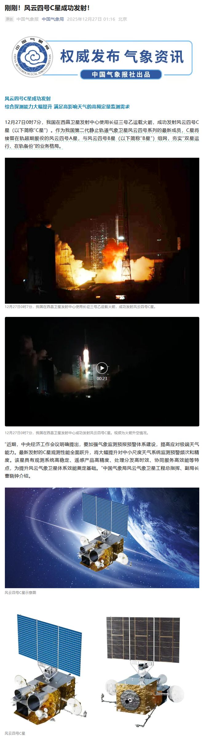 IT之家12月27日消息,北京时间今天0时07分,我国在西昌卫星发射中心使用长征三号乙运载火箭,成功将风云四号03星(风云四号C星)发射升空,卫星顺利进入预定轨道,发射任务获得圆满成功。据悉,该卫星是目前全球单星综合探测能力最强的静止轨道气象卫星。