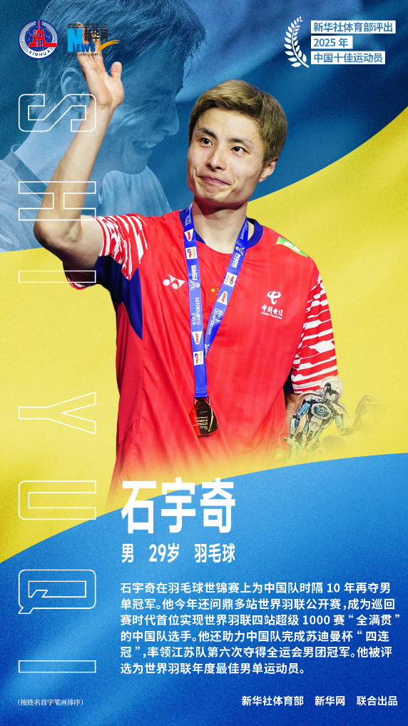 石宇奇在羽毛球世锦赛上为中国队时隔10年再夺男单冠军。他今年还问鼎多站世界羽联公开赛,成为巡回赛时代首位实现世界羽联四站超级1000赛“全满贯”的中国队选手。他还助力中国队完成苏迪曼杯“四连冠”,率领江苏队第六次夺得全运会男团冠军。他被评选为世界羽联年度最佳男单运动员。