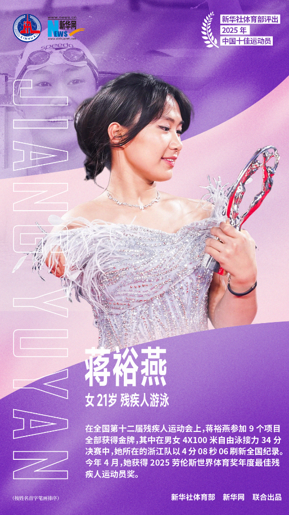 在全国第十二届残疾人运动会上,蒋裕燕参加9个项目全部获得金牌,其中在男女4X100米自由泳接力34分决赛中,她所在的浙江队以4分08秒06刷新全国纪录。今年4月,她获得2025劳伦斯世界体育奖年度最佳残疾人运动员奖。