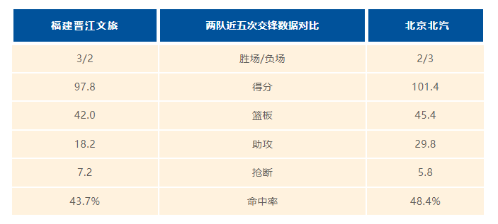 福建晋江文旅男篮与北京北汽男篮历史上一共交手46次,福建晋江文旅男篮16胜30负。上赛季两队交手2次,福建晋江文旅男篮0胜2负。