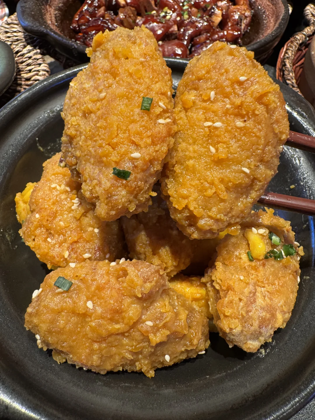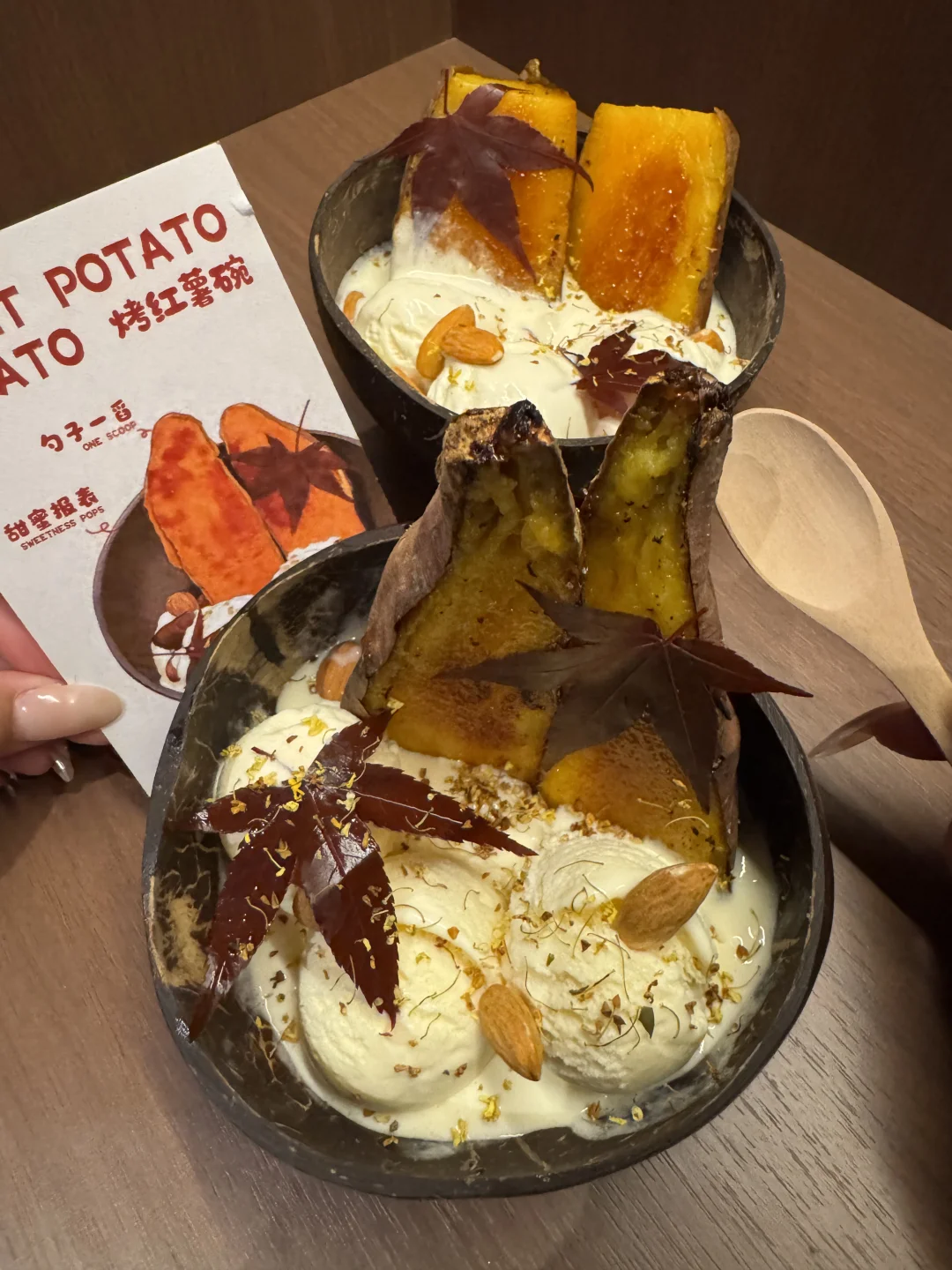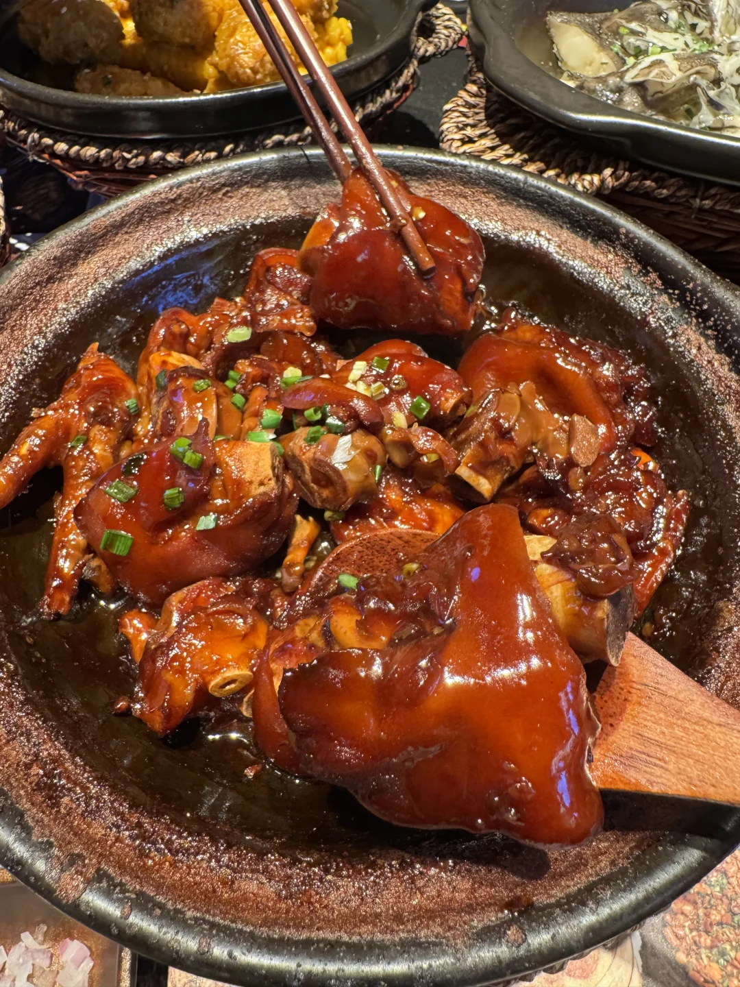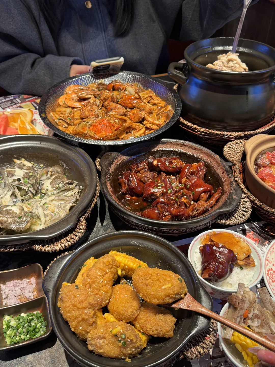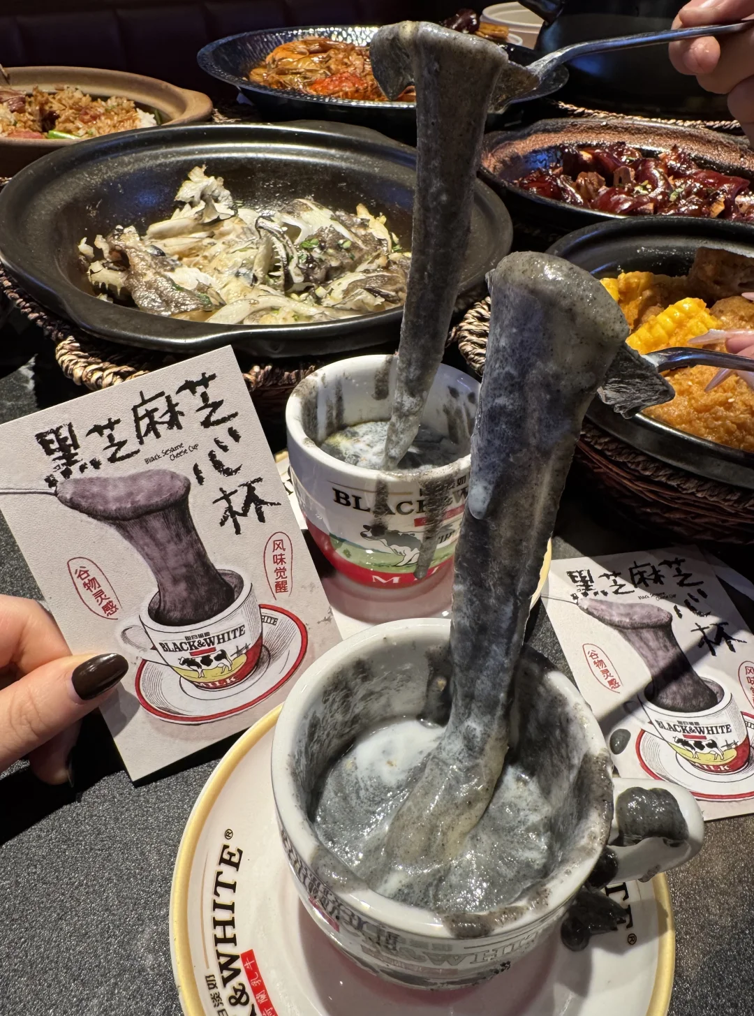 谁懂吃到这一顿有多幸福!! 芝麻糊已经top level!疯狂拉丝🤤吃起来就是芝士味的糯糯麻薯口感!! 烤红薯碗🤤甜甜糯糯的!是秋冬的幸福感~ 还有满满一锅羊肉煲🍲连喝好几碗汤!! 黄油焗鸦片鱼头、猪蹄凤爪煲、咸蛋黄鸡中翅…各种砂锅菜都嘎嘎香!!煲仔饭推荐!锅巴香脆~