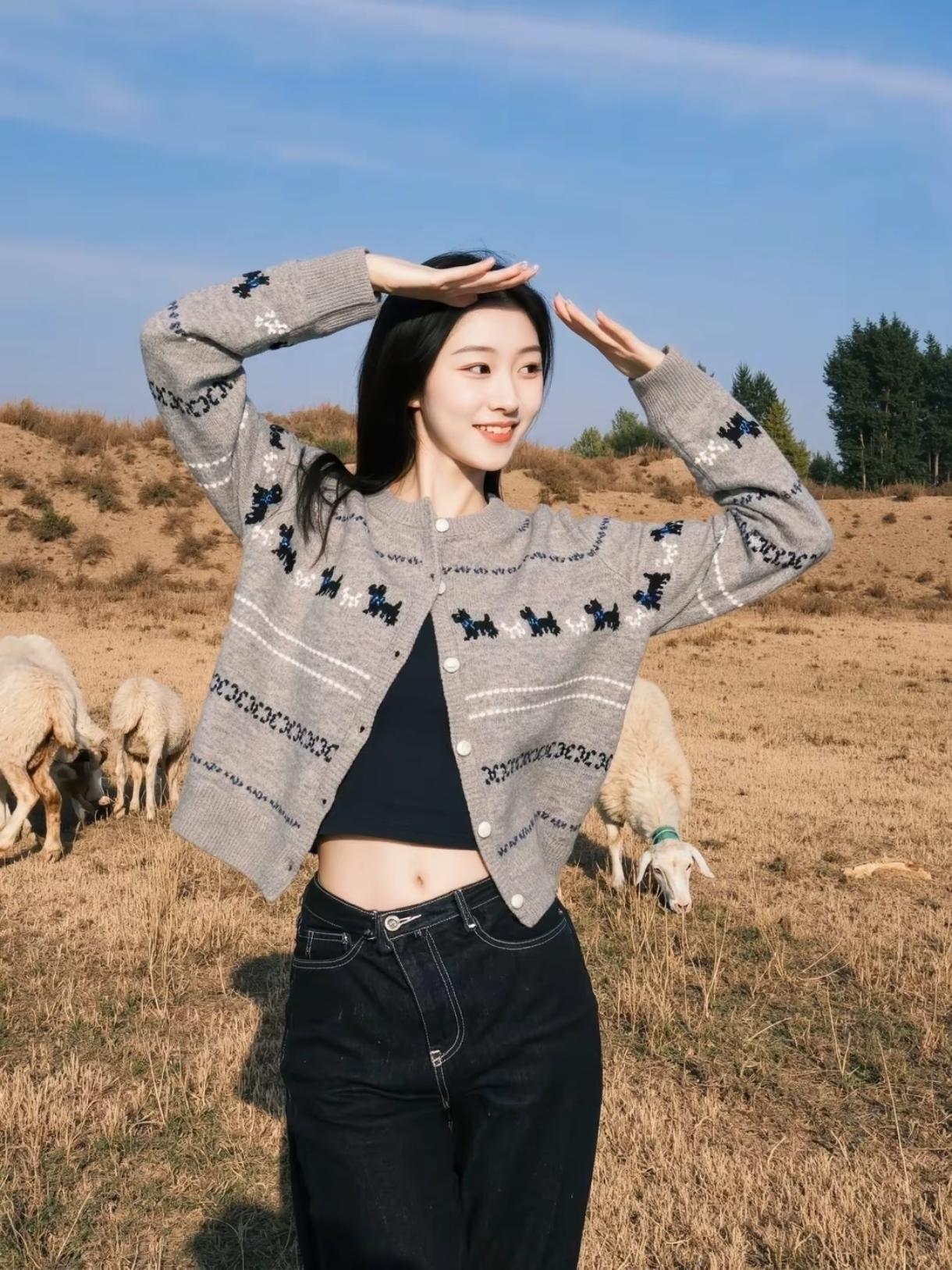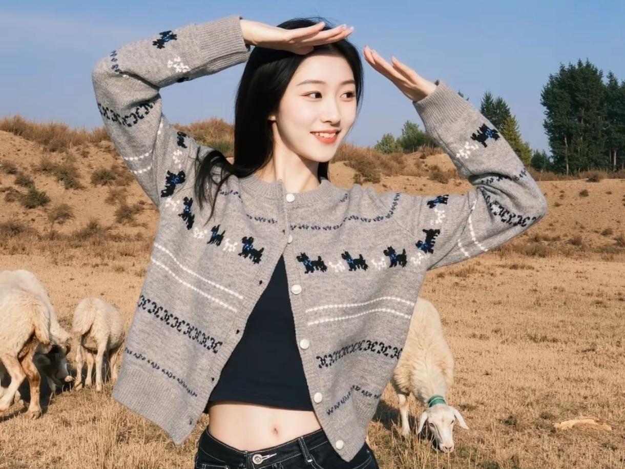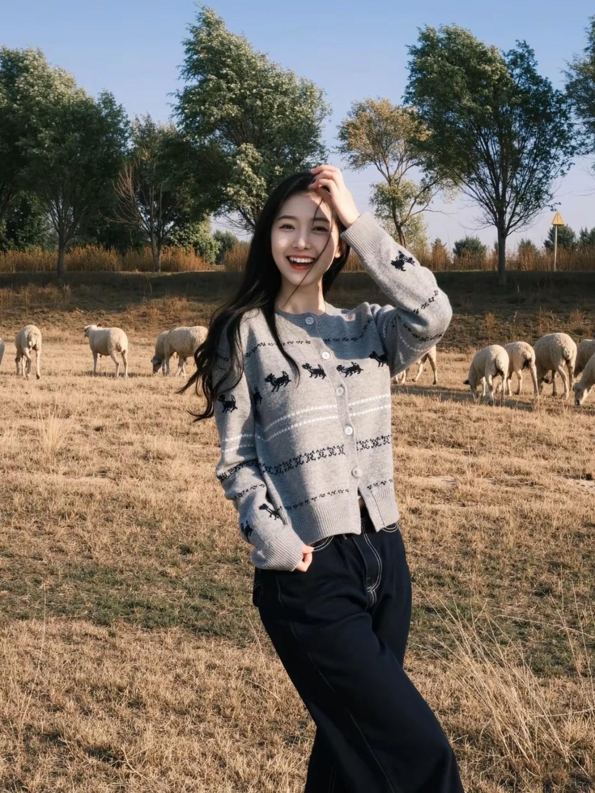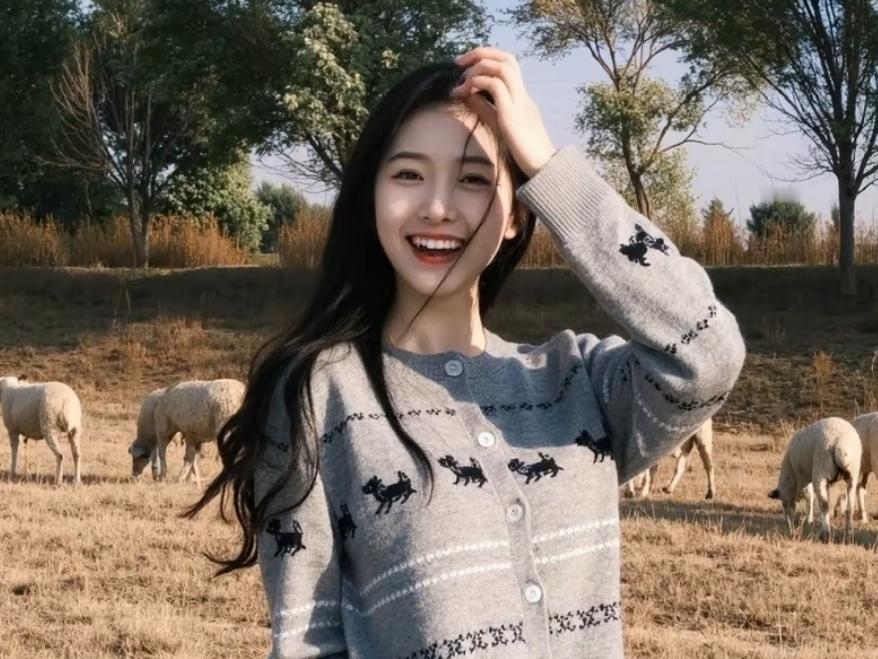 野坡的晴 秋阳把草地烘成浅黄的绒毯 羊群散在坡上,像撒了一把蓬松的云絮 灰毛衣的纹路跳着,和羊蹄踩碎草秆的轻响 凑成一截软乎乎的调子 她抬手拢住乱飞的发,笑声撞在风里 碎成满天晃眼的光斑 又把双手架成小檐,望远处的树影 望云絮飘向天边的模样 阳光舔着她的发梢,舔着毛衣的白纽扣 她的笑比秋阳更烫几分 羊群低头啃着草,偶尔抬眼望她 像望一朵突然落在野坡的花 风卷着干草的香,绕着她的衣角打旋 她歪头自拍的瞬间 蓝天跌进眼底,羊群成了模糊的背景 整个野坡的晴,都被她攥在掌心 连那些懒洋洋的羊,都停下嘴 想蹭一蹭这人间的甜