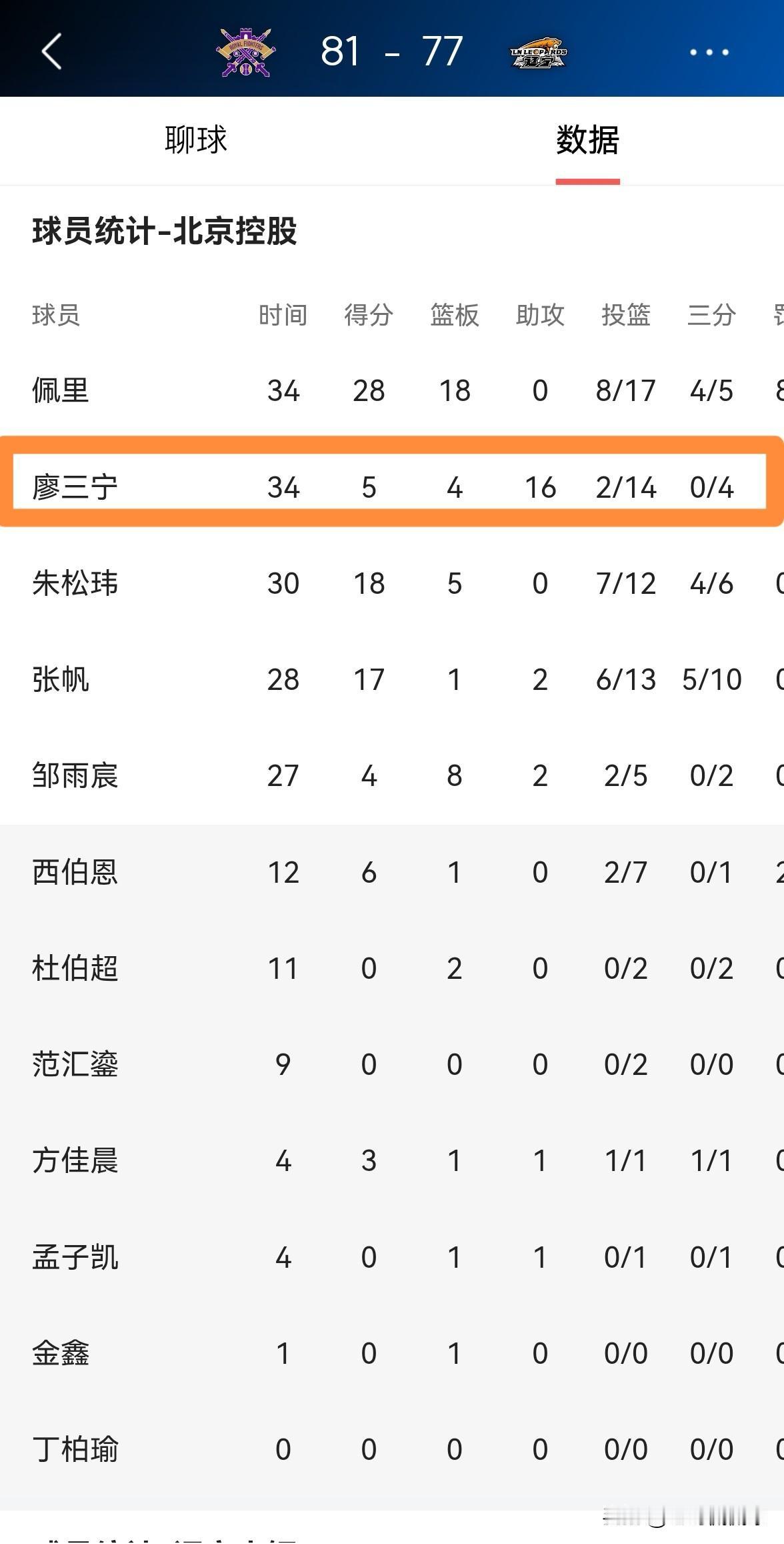 北京控股控卫廖三宁真是威斯布鲁克附体了!在今天北京控股主场以81:77险胜辽宁本钢的比赛中,廖三宁打出了NBA球星威斯布鲁克式的数据。 全场比赛下来,廖三宁首发出战34分钟,投篮14中2,其中三分球4中0、罚球2中1得到5分4篮板16助攻2抢断1盖帽,还有3次失误,他的场上正负值为0。 请问大家觉得今天的廖三宁像不像威斯布鲁克?