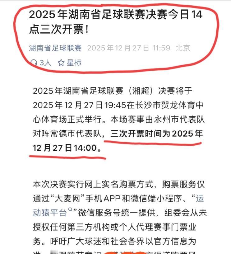 湘超决赛门票决赛开打前5个小时第三次开票,这种操作还是第一次看到。球迷吐槽:这是从一开始就没有想着把票放给外地球迷啊? 而这番操作造成的后果是:那些真的想看比赛的,无论是外地的还是长沙本地的,最后都没有抢到球票。因为外地人也在抢,本地人也在抢,外地人抢到了最后没去,本地人却抢不到! 有广西网友吐槽道:提前买了高铁没抢到票,扣了我50手续费! 可今天长沙贺龙体育馆的上座率好像是46000多,貌似也没有多少空的座位吧?这到底咋回事,意思是最后几个小时还是把票全部卖出去了?