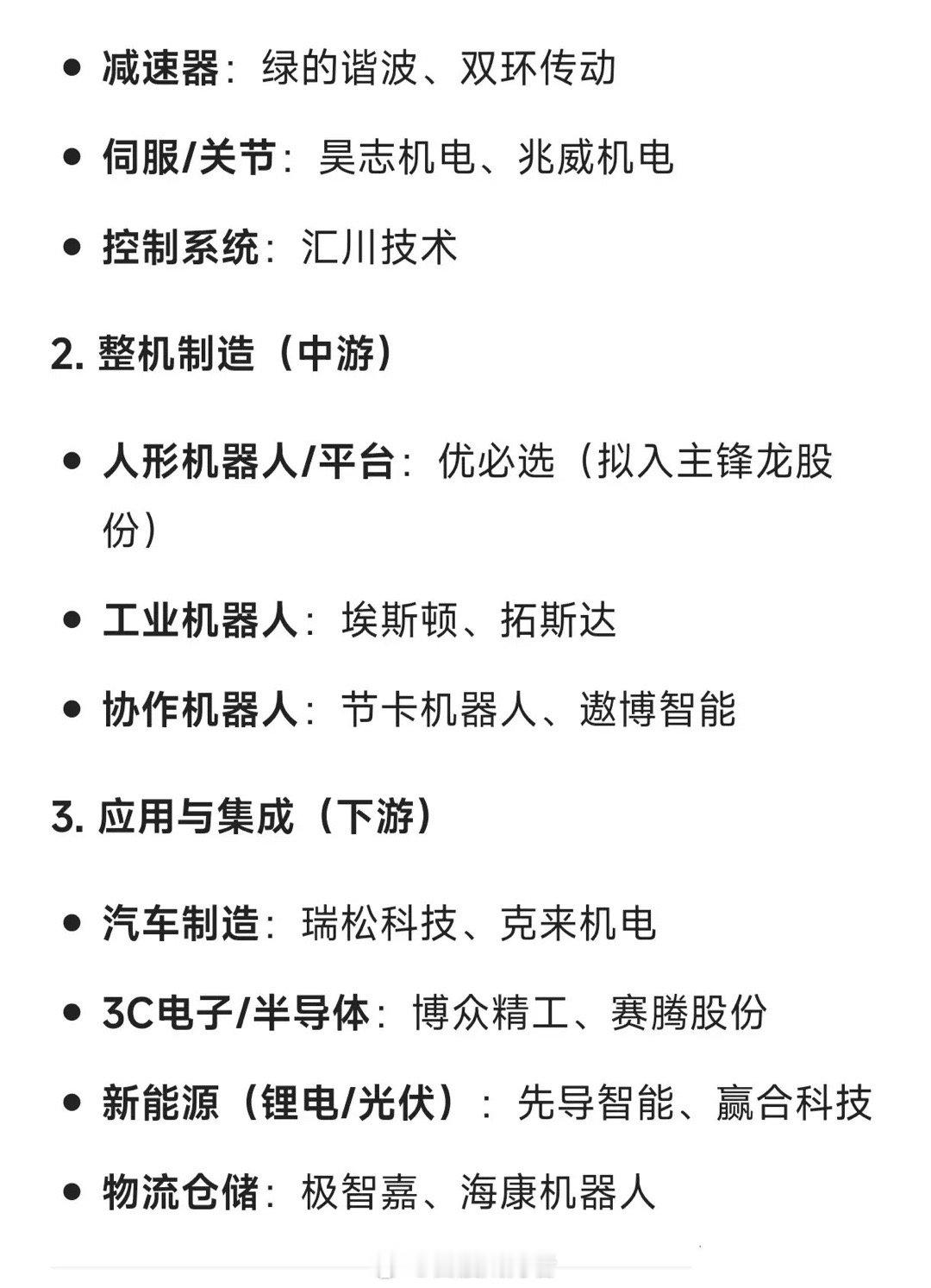 🤖 机器人产业链核心龙头全梳理1. 上游核心零部件(机器人“心脏”与“神经”)• 减速器:绿的谐波(精密谐波减速器龙头,技术指标对标国际一线)、双环传动(RV减速器量产能力领先,适配多场景)• 伺服系统/关节模组:昊志机电(高精度伺服电机市占率突出)、兆威机电(微型传动关节技术领先,适配小型化机器人)• 控制系统:汇川技术(自主研发控制器,与工业机器人适配性强,覆盖多行业)2. 中游整机制造(从图纸到实体的“锻造者”)• 人形机器人/通用平台:优必选(拟通过入主锋龙股份加速商业化,人形机器人Walker X技术成熟度领先)• 工业机器人:埃斯顿(自主核心部件+整机一体化,汽车生产线适配度高)、拓斯达(轻型协作机器人出货量居前)• 协作机器人:节卡机器人(柔性交互技术突出,适合人机共融场景)、遨博智能(协作机器人出口量领先,覆盖海外市场)3. 下游应用与集成(让机器人“落地生花”)• 汽车制造领域:瑞松科技(车身焊接机器人集成龙头)、克来机电(新能源汽车电池装配自动化方案核心供应商)• 3C电子/半导体:博众精工(芯片封装测试机器人精度达微米级)、赛腾股份(消费电子组装线柔性机器人系统领先)• 新能源(锂电/光伏):先导智能(锂电池生产全流程机器人集成)、赢合科技(光伏组件搬运机器人效率行业领先)• 物流仓储:极智嘉(AGV机器人全球市占率居首)、海康机器人(视觉导航仓储机器人技术标杆)从核心部件到场景落地,机器人产业链各环节龙头已形成技术壁垒与规模优势,随着人形机器人商业化加速,具备全链条整合能力的企业或将占据更大先机。