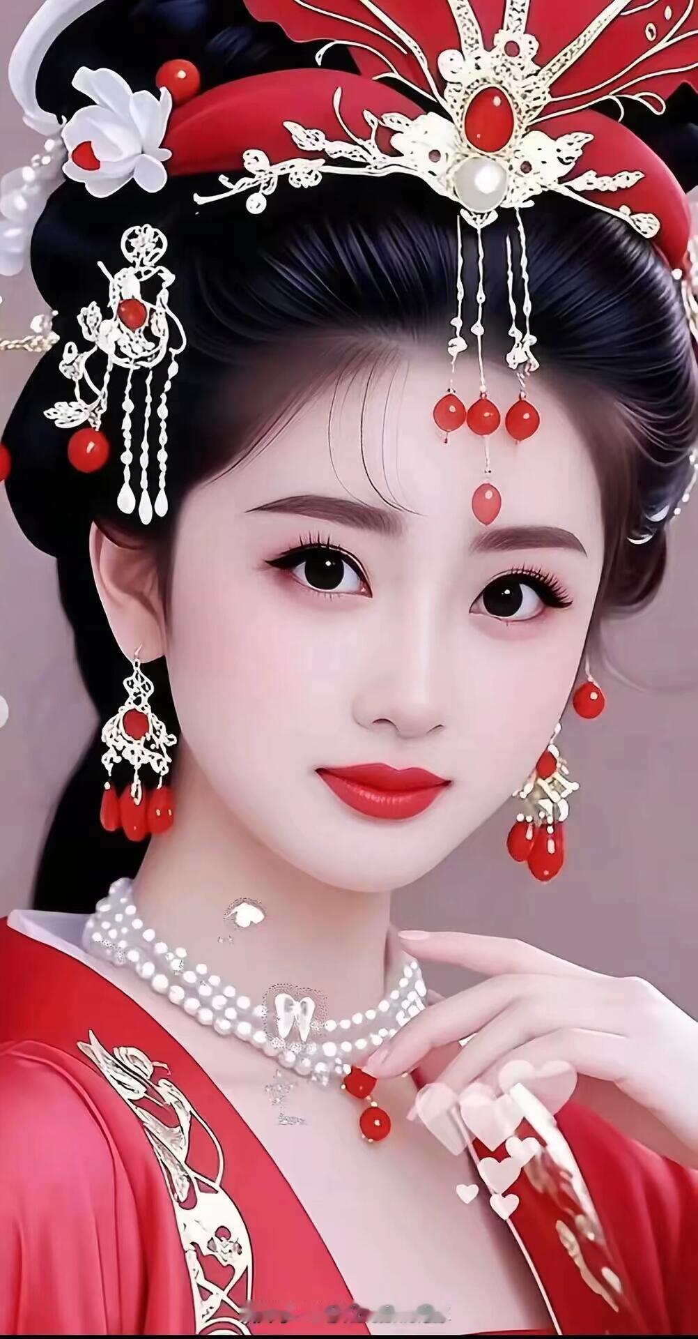 古风美女,黑发红唇,优雅气质,传统服饰,背景红墙