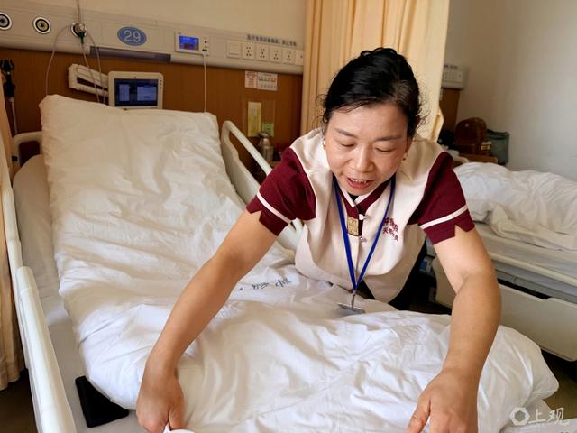51岁的马爱英,穿着复旦大学附属肿瘤医院红白相间的“肿瘤医院护理员”制服,淡色口红衬得她气色颇佳。在这家医院,她已经待了12年。今年起,她的身份有了一个让她颇为自豪的变化——“现在我是护理员,是病区护理团队的一员了。”在肿瘤医院浦东院区胰腺外科病房,手脚麻利、服务态度好的马爱英是家属们交口称赞的对象。她通常负责照顾4—6名病人,记者见到她时,她正忙着给一名胰腺癌术后一级护理患者铺床,随后又耐心地指导患者做踝泵运动:“先把腿伸平,默数5秒,脚尖勾起来,脚踝慢慢旋转……”这套动作,是为了防止患者长期卧床引发静脉栓塞,助力早期康复。