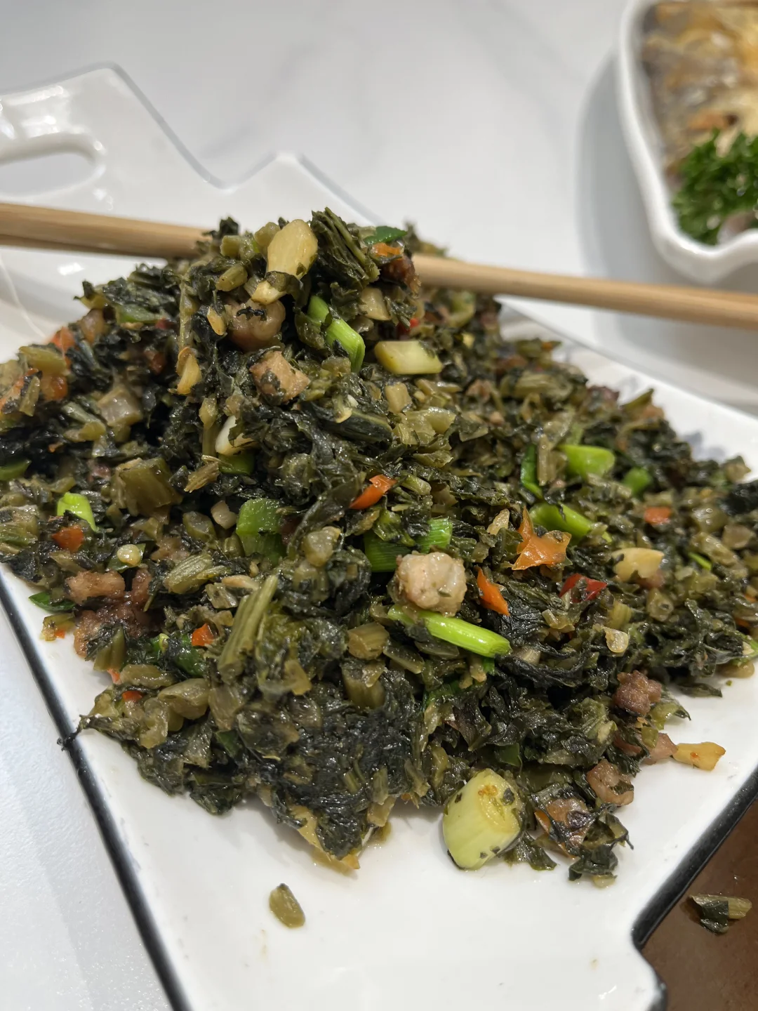 在煎制阳干鱼时,最好农家菜籽油小火慢慢煎,急不得,注意翻面,大概20分钟左右。装盘时,讲究的人家,一定要在鱼身划几刀,是全鱼一条,但要成一块一块的状态,好让客人拈。阳干鱼没有那种湿冷的江湖感,反而有一种阳光的味道,鱼鳞被煎到“起酥”,入口是一种曼妙的酥脆感,鱼肉咸香紧致,下饭佐酒,均是妙品。