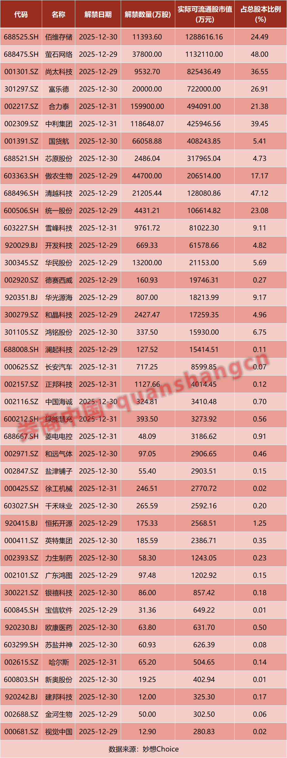 从解禁市值来看,解禁市值居前三位的是:佰维存储(128.86亿元)、萤石网络(113.21亿元)、尚太科技(82.54亿元)。