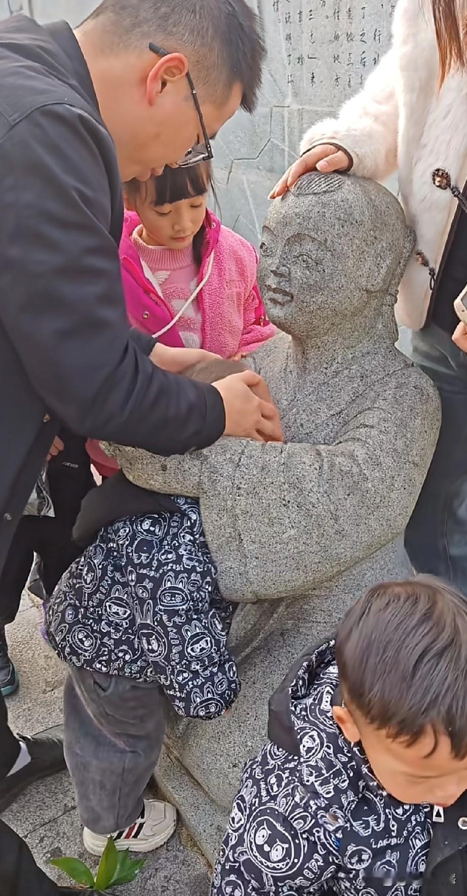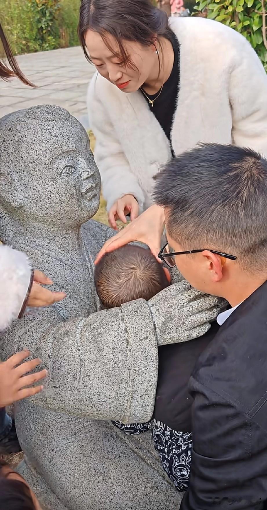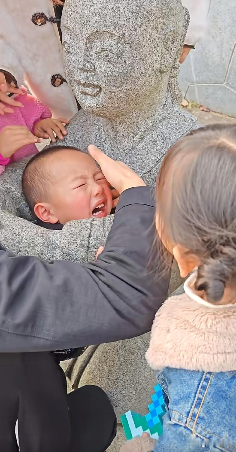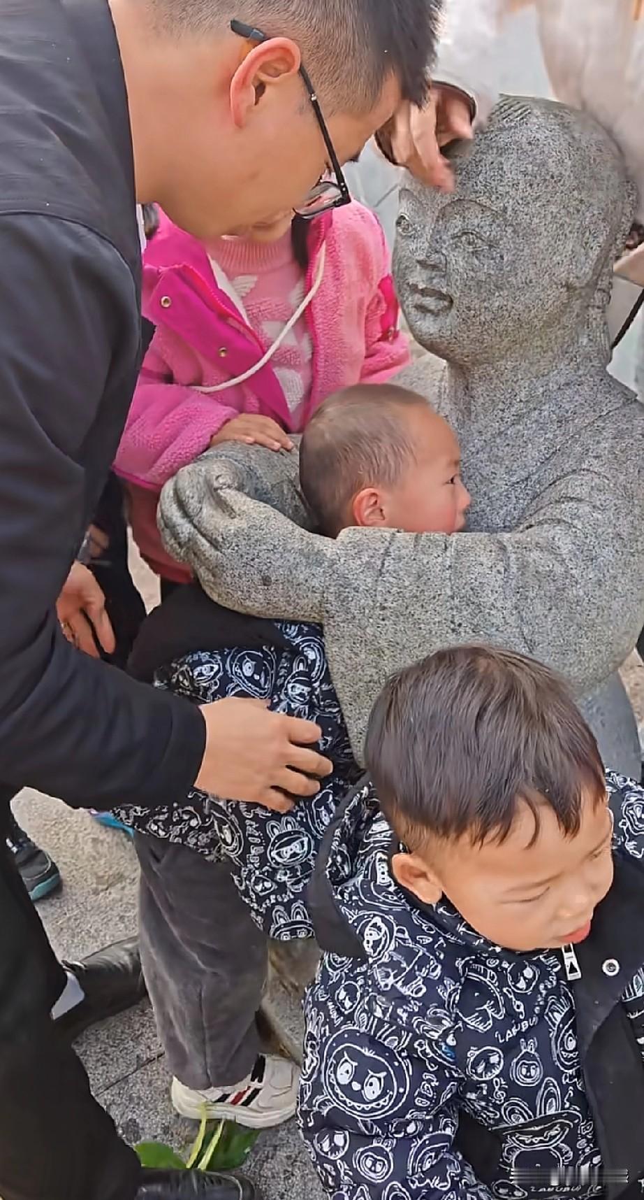当家长的领着孩子出来游玩,一定要看护好自己的孩子,小孩子淘气,小孩子好动,由于孩子小,对一些事情无法做出正确的判断,就容易产生一些非常不好的后果,画面中的这个孩子,也不知道是什么原因,把头钻进了雕像的手臂之间,由于孩子的脑袋大,进去的时候很容易,出来的时候可就难喽!