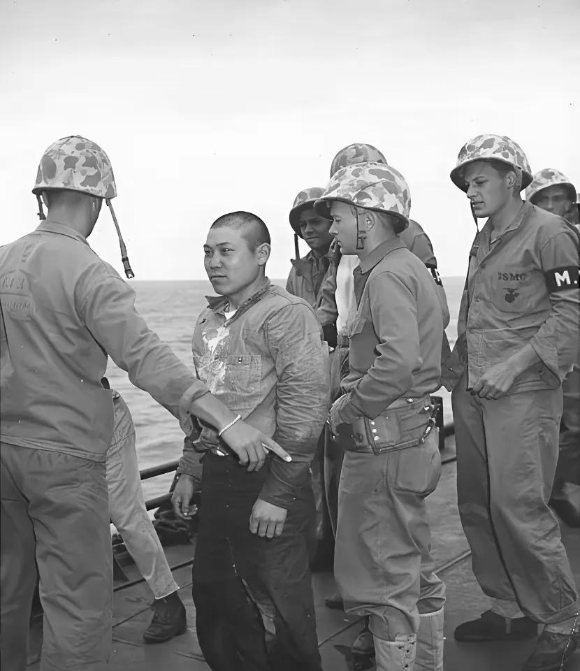 这是1945年,美军于硫磺岛战役中俘获的日军士兵。那些日本士兵身形矮小,面对高大的美军,眼神里却满是不屑。硫磺岛战役让美军吃尽了苦头,对于那些躲在山洞里负隅顽抗的日军而言,火焰喷射器成了美军最好的武器,战斗过后基本不留活口。