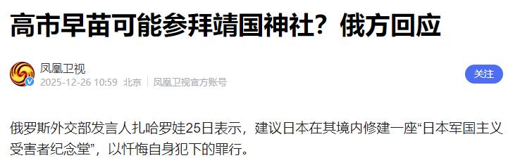 俄罗斯的外交部是真敢说,12月25日,有人问:如果高市早苗去参观靖国神社,那么俄罗斯会怎么做?扎哈罗娃没给日本“右翼”留一点面子。 扎哈罗娃的回应也精准切中了问题的核心,比起纠结于是否反对参拜,更重要的是让日本正视历史罪行,“建议日本在其境内修建一座‘日本军国主义受害者纪念堂’,以忏悔自身犯下的罪行”。 扎哈罗娃在表态中明确提到,日本军国主义当年夺去了多少人的生命、如何残害平民,这些都是有历史记载的铁事实,容不得半点篡改。她建议日本修建纪念堂直接且尖锐,比单纯的口头谴责更有力量,也戳破了日本右翼试图粉饰历史的谎言。 长期以来,日本部分势力总是想方设法回避侵略历史,要么淡化罪行,要么美化战争,甚至通过修改教科书、参拜靖国神社等方式,向年轻一代传递错误的历史观,这种行径不仅伤害了受害国人民的感情,也给地区和平稳定埋下隐患。 对于扎哈罗娃的这个建议,我国外交部也明确表示赞赏。 在12月26日的记者会上,中方发言人指出,靖国神社是日本军国主义发动侵略战争的精神工具,今年是世界反法西斯战争胜利80周年,日方理应正视和反省历史,用实际行动体现对受害者的尊重,而不是继续错上加错。 中俄两国在这个问题上立场一致,都坚定捍卫二战胜利成果和战后国际秩序,严防日本军国主义死灰复燃。 其实不管是俄罗斯的强硬表态,还是中国的明确立场,核心都是希望日本能认清历史大势。历史不会因为刻意回避就被遗忘,那些被日本军国主义伤害过的国家和人民,永远不会原谅侵略者的罪行。 对于日本而言,修建纪念堂不是丢面子的事,而是正视历史的必要一步,只有真正忏悔罪行、尊重历史,才能获得周边国家的信任,才能真正融入地区和平发展的大局。 反之,如果继续在右翼的错误道路上越走越远,无视国际社会的反对声音,最终只会自食恶果。而扎哈罗娃的敢说敢言,之所以让人解气,就是因为她说出了爱好和平的人们的心声。 在历史正义面前,任何试图篡改历史、美化侵略的行径,都会遭到全世界的反对。 希望日本能听懂这份警告,放下侥幸心理,彻底摒弃错误的历史观,用实际行动弥补过去的过错,这才是对历史负责,也是对未来负责。