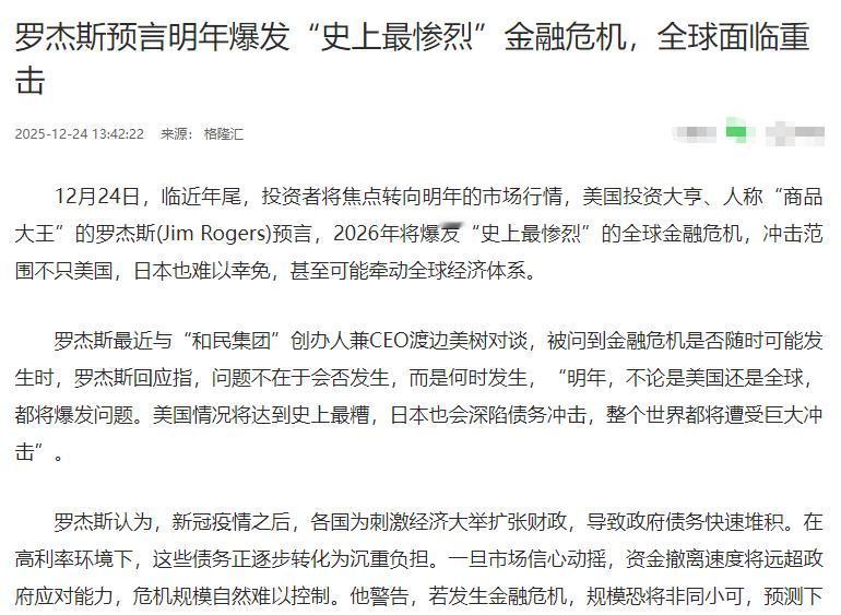 知名投资人罗杰斯说:“史上最惨烈的金融危机,将在2026年发生,而这场危机主要来自于两个原因,一个是疫情后各国疯狂的债务增长,另一个就是人工智能的泡沫。” 2020年疫情来袭后,全球很多国家尤其是美国,为了稳住经济、保障民生,采取了大量花钱的政策,钱不够就靠发行国债来借。这种做法短期内确实起到了作用,但长期来看,却埋下了巨大的隐患。 美国最新数据显示,2025年11月美国可流通国债余额首次突破30万亿美元,达到30.2万亿美元,而包含政府内部欠款的国家债务总额更是高达38.4万亿美元。 更让人担忧的是,美国现在每年要付的国债利息就有1.2万亿美元,哪怕靠加征关税增加了收入,也不够覆盖这笔巨额利息,更何况关税战最后还以失败收尾。 当然,不只是美国,其他不少国家的债务问题也很突出。比如日本,虽然债务总量看起来比美国少,约为9万亿美元,但按债务率算,也就是债务占国内生产总值的比例,预计年末会高达235%,在主要经济体中遥遥领先。 罗杰斯认为,日本的相关经济政策相当于饮鸩止渴,靠借债来对冲通胀,最终很可能因扛不住利息压力而崩盘。这种各国债务高企的情况,就像一张越拉越紧的网,一旦某个国家先撑不住,就可能引发全球性的连锁反应,这也是罗杰斯判断金融危机的重要依据之一。 而除了各国疯狂举债带来的隐患,罗杰斯还重点提到了人工智能的泡沫问题。这两年人工智能确实火得一塌糊涂,不管是企业还是投资者,都扎堆涌入这个领域。 但火过头就容易出现泡沫,简单说就是很多人工智能相关企业的价值被高估了,实际盈利能力根本跟不上。从市场数据能看出来,不少人工智能板块的个股,市盈率高得离谱,有的甚至达到几百倍,还有的企业根本没有盈利,市值却被炒到了几千亿。 罗杰斯自己也说,当前全球资产价格普涨,尤其是在宽松资金的推动下,很多市场都表现强劲,但当所有资产同时上涨时,正是需要提高警惕的时候。人工智能领域的这种过热炒作,一旦市场情绪转向,资金大量撤离,泡沫就会破裂,进而影响整个金融市场的稳定。 罗杰斯他作为资深投资人,经历过多次金融危机,对市场风险有着敏锐的洞察力。而且目前各国债务高企、人工智能领域过热的情况,都有真实数据和市场现象支撑,并非虚构。 不过,罗杰斯本人也并非“全知全能的神仙”,他的预言我们可以警惕并为此做好准备来抵抗可能的风险。但也不必因此而过于恐慌,因为现实可能比我们想象的要坚韧得多。