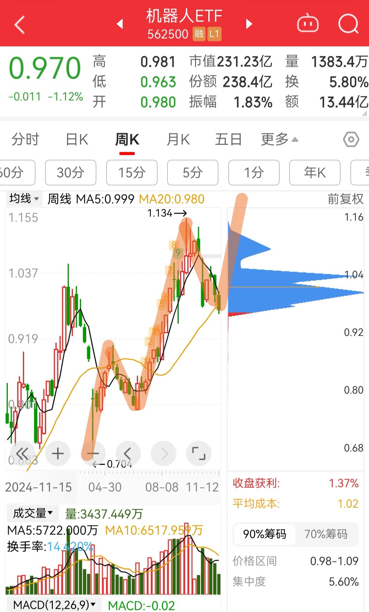 科技板块中,资金一直在买的方向 随着科技板块的调整,机器人etf的份额一直在增加,资金出现越跌越买的迹象。 从浪型来看,本轮调整abc浪结构完整,意味着3-4浪随时可能结束,开启3-5的上涨。 昨天微微跌破了20周线,今明两天看看能不能收回。这里是一个比较重要的支撑位,不能有效跌破。