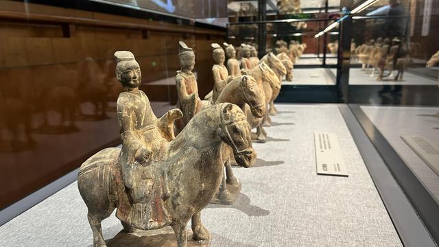 此次展出甲胄骑兵俑、风帽鼓乐骑俑、笼冠鼓乐骑俑等多组陶俑。展柜中,人俑骑乘骏马,或着铠甲手执武器,或头戴风帽手持乐器,活灵活现。“这些陶俑初看相似,细看各有千秋。每个人物的表情、动作,还有衣褶、马鞍这些细节,都有差异。”专家介绍,甲胄骑兵俑属于仪仗中的军卒,上身穿圆领窄袖衣,外罩甲胄,身后右侧斜背一箭囊,人物拳心的小孔里原来应该插有武器等物。鼓乐骑俑面部丰满,身穿交领右衽宽袖褶服,做各种演奏动作。