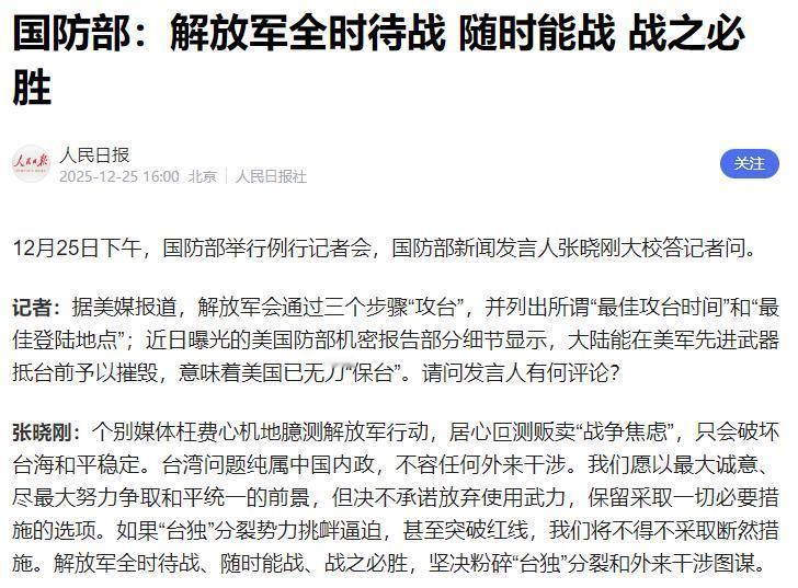 中国国防部向全世界宣布:中国人民解放军全时待战,随时能战,战之必胜。坚决粉碎“台独”和外来干涉图谋。 12月25日,中国国防部的这一声宣告铿锵有力、掷地有声,向全世界传递出中华民族捍卫国家主权的坚定意志。这一表态字字千钧、振聋发聩,既彰显了中国维护国家完整的决心不可动摇,也让亿万中华儿女倍感振奋、万众一心。 台湾自古以来就是中国领土不可分割的一部分,这是国际社会公认的事实,《开罗宣言》《波茨坦公告》等一系列国际法文件早已明确确认。可如今,民进党当局却背道而驰,勾结外部势力大搞“台独”分裂活动。 赖清德当局无原则跪美输诚,疯狂推进穷兵黩武的行径,一边鼓吹“以实力求和平”的谬论,一边推动高额军购,把台湾民众的福祉当作筹码,完全是不折不扣的“和平破坏者”和“战争煽动者”。 更令人愤慨的是,美方不断背弃自身承诺,变本加厉对台售武,近期甚至通过涉台消极法案,安排巨额资金用于所谓“台湾安全合作倡议”,其单次对台军售金额就创下历史新高。 这种“以台制华”的险恶用心昭然若揭,不仅向“台独”分裂势力发出严重错误信号,更把台海地区一步步推向兵凶战危的险境,严重破坏了地区和平稳定。而民进党当局对此听之任之,任由美方敲骨吸髓,把台湾的资源耗尽榨干,丝毫不管台湾民众的死活。 面对这样的严峻局势,中国人民解放军的表态也就成了最有力的警告。 今年以来,解放军军机绕台已近3600架次,创历年新高,常态化的战备警巡和实战化演练,都是维护国家主权的正当必要举措,合理合法。 解放军打“独”促统从未停歇,“台独”势力每挑衅一次,我们的反制就加压进逼一步,这背后是日益强大的国防实力,是全军将士保家卫国的赤胆忠心。 我们始终愿意以最大诚意、尽最大努力争取和平统一的前景,因为和平统一符合两岸同胞的共同利益。但这绝不意味着我们会容忍“台独”分裂行径,绝不承诺放弃使用武力。 任何企图分裂自己国家的人,都将被永远钉在历史的耻辱柱上;任何外来势力的干涉,都无法阻挡中国统一的历史大势。 现在,越来越多的台湾民众已经看清真相,参与“弹劾赖清德”联署的人数超过800万,越来越多人明白“台独”意味着战争,是死路一条。 祖国统一势不可挡,这是民心所向、大势所趋。中国人民解放军全时待战的状态,是对“台独”分裂势力的严正警告,是对外部干涉势力的有力震慑。 我们坚信,在强大的人民军队守护下,在全体中华儿女的共同努力下,任何分裂国家的图谋都注定失败,祖国完全统一的目标一定能够实现。